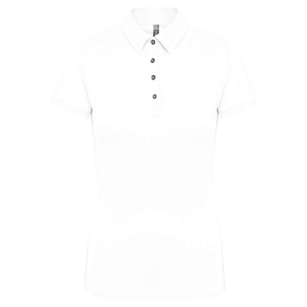 Damskie polo z jersey z bawełny i poliestru, zapewniające optymalną komfort i dobry wygląd. Klasyczny kroj z kołnierzem koszulowym i klapką z 4 metalowymi guzikami. Wstawki na ramionach dla lepszej struktury. Wykończenie bord-côte na dole rękawów. Podwójne szwy na dole ubrania dla większej trwałości.