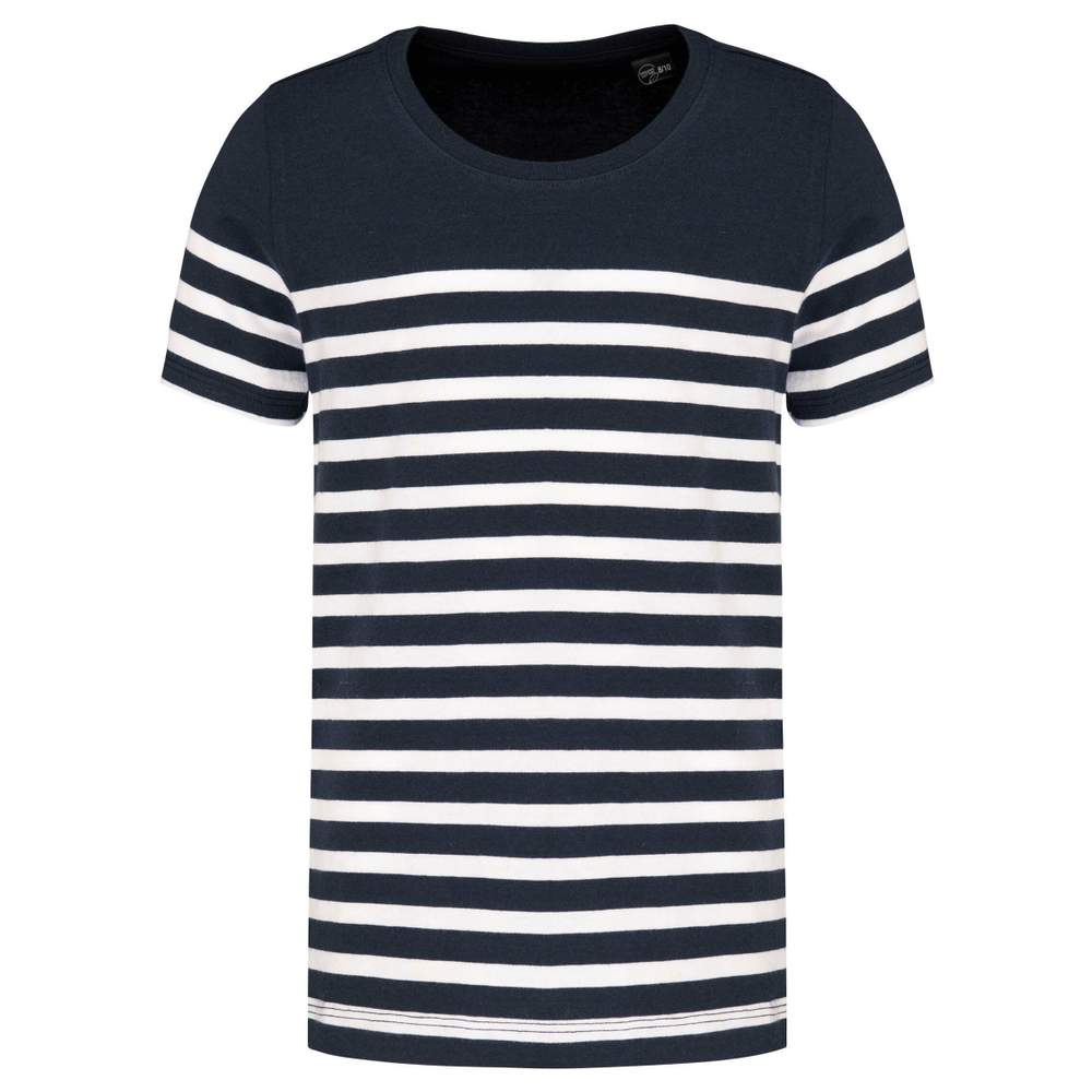 Dziecięca koszula marynarska. Prostokątny kroj. Okrągła szyja z obrzeżem 1x1. Pasy skakane. Pas ochronny na kołnierzu. Wykończenie dwustronne na dole rękawów i dole ubrania. Koszula ta jest wykonana z 100% organicznego, szczotkowanego bawełny. Certyfikat (Global Organic Textile Standard) jest wydawany przez Ecocert Greenlife.
