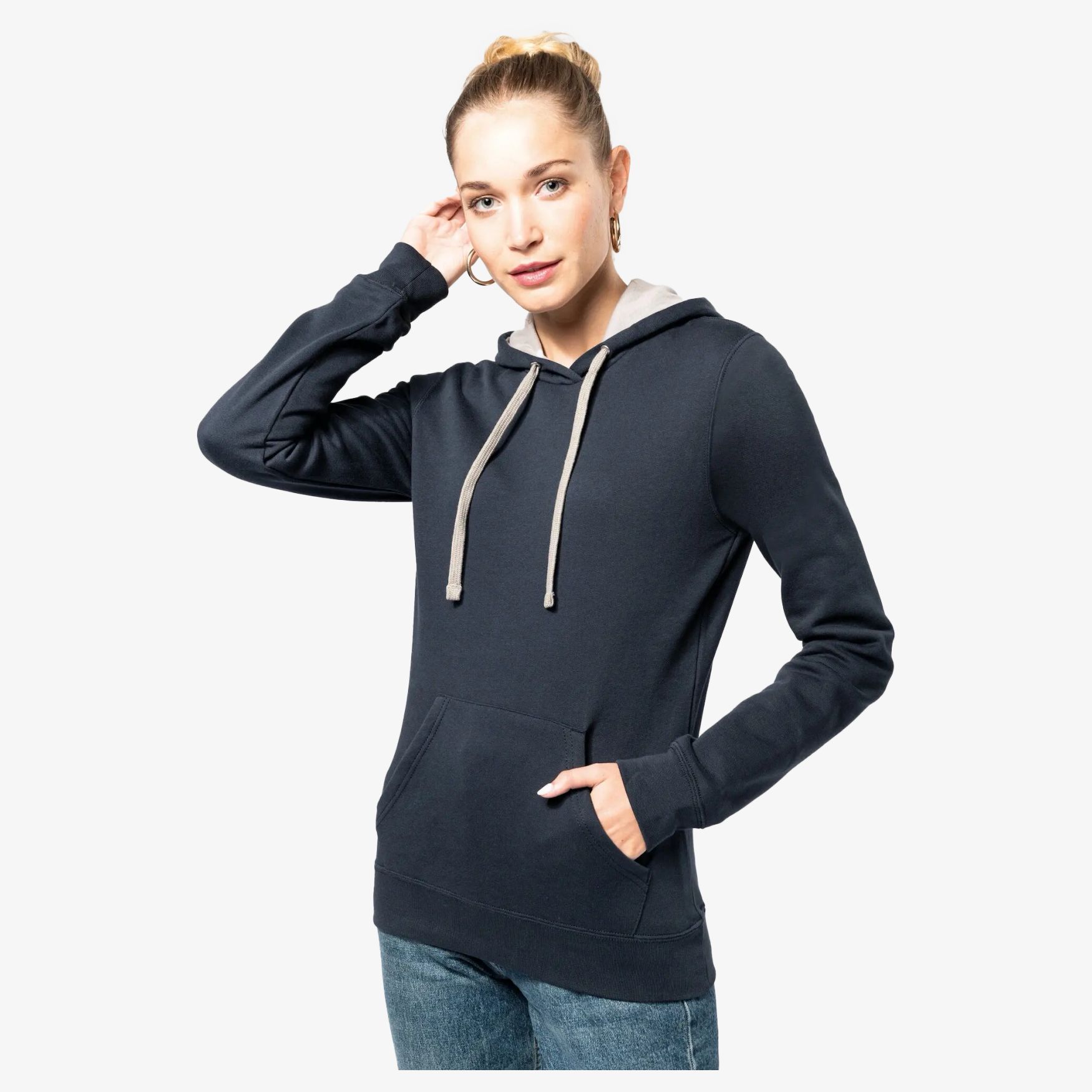 Sweat-shirt z kapturem kontrastowym dla kobiet, wykonany z 80% bawełny czesanej i 20% poliestru. Ma konstrukcję z grubego pluszu dla zwiększonego komfortu. Model ten wyposażony jest w praktyczną kieszeń kangura i wbudowany otwór na słuchawki. Wykończenia obejmują obręcze na końcach rękawów i na dole ubrania, a także podwójną i kontrastową kapturę z sznurówką.