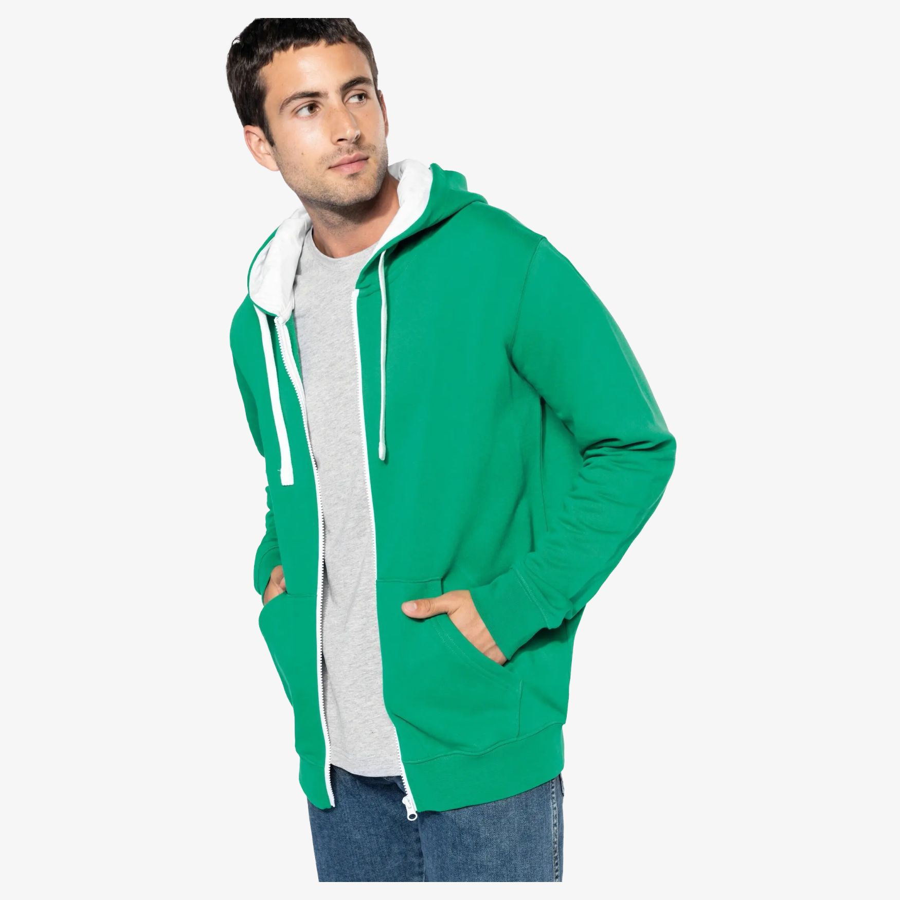 Blazer zippowany kaptur kontrastowy, wykonany w 80% z bawełny czesanej i 20% poliestru. Charakteryzuje się molletonem gratté dla zwiększonego komfortu. Ten blazer wyposażony jest w pasażek dla słuchawek zintegrowany w kieszeni kangurze i wycięcie kołnierza. Pasy elastyczne na dole rękawów i ubrania zapewniają optymalne dopasowanie. Kaptur jest podwójny i kontrastowy, z sznurkiem regulacyjnym dla indywidualnego dopasowania. Kontrastowy zip YKK® dodaje stylu.