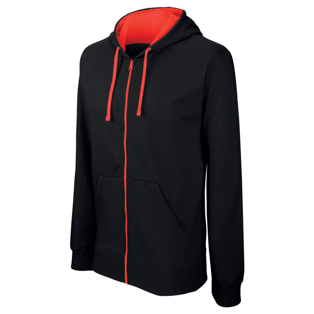 Blazer zippowany kaptur kontrastowy, wykonany w 80% z bawełny czesanej i 20% poliestru. Charakteryzuje się molletonem gratté dla zwiększonego komfortu. Ten blazer wyposażony jest w pasażek dla słuchawek zintegrowany w kieszeni kangurze i wycięcie kołnierza. Pasy elastyczne na dole rękawów i ubrania zapewniają optymalne dopasowanie. Kaptur jest podwójny i kontrastowy, z sznurkiem regulacyjnym dla indywidualnego dopasowania. Kontrastowy zip YKK® dodaje stylu.