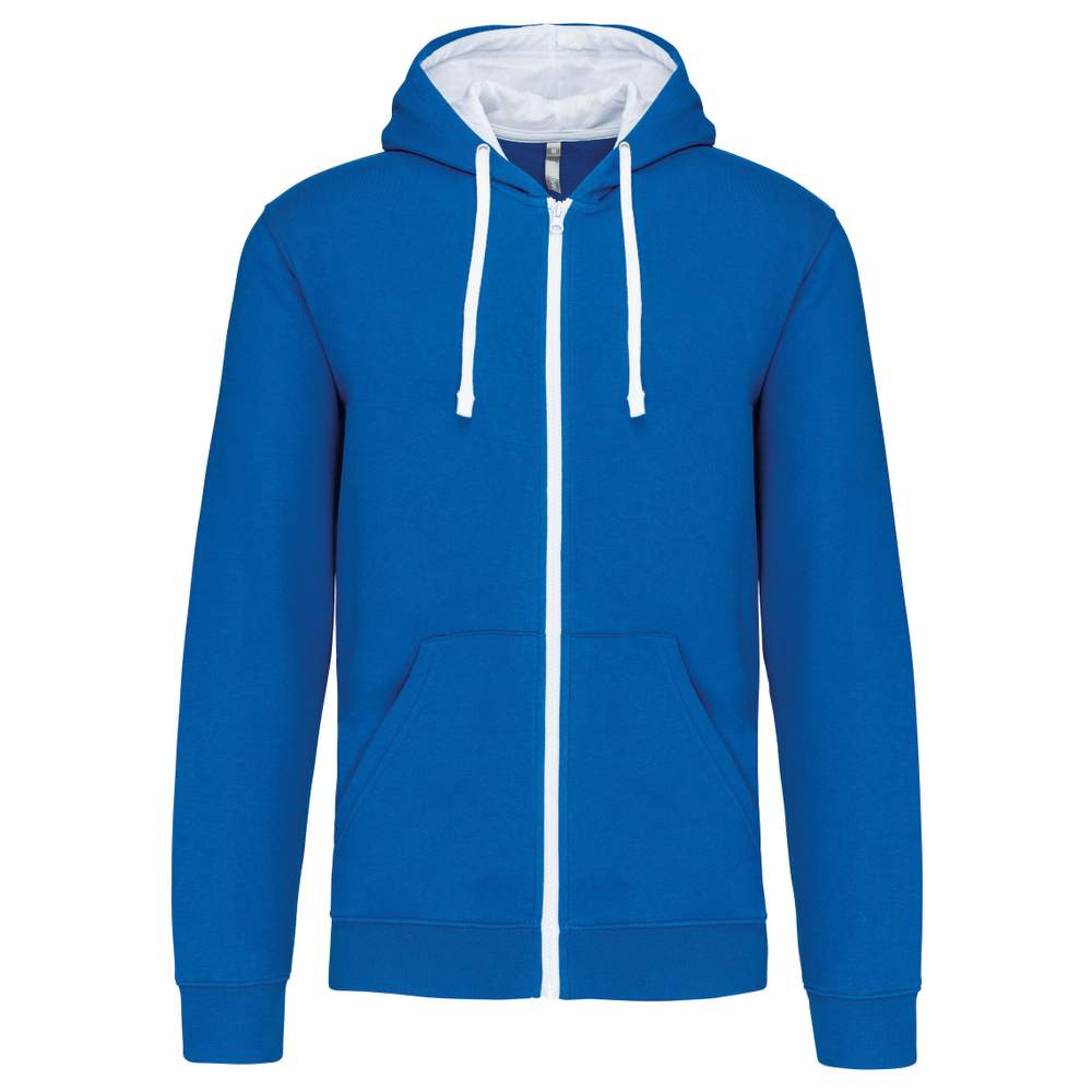 Blazer zippowany kaptur kontrastowy, wykonany w 80% z bawełny czesanej i 20% poliestru. Charakteryzuje się molletonem gratté dla zwiększonego komfortu. Ten blazer wyposażony jest w pasażek dla słuchawek zintegrowany w kieszeni kangurze i wycięcie kołnierza. Pasy elastyczne na dole rękawów i ubrania zapewniają optymalne dopasowanie. Kaptur jest podwójny i kontrastowy, z sznurkiem regulacyjnym dla indywidualnego dopasowania. Kontrastowy zip YKK® dodaje stylu.