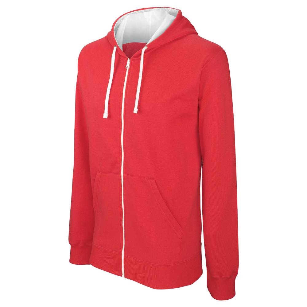 Blazer zippowany kaptur kontrastowy, wykonany w 80% z bawełny czesanej i 20% poliestru. Charakteryzuje się molletonem gratté dla zwiększonego komfortu. Ten blazer wyposażony jest w pasażek dla słuchawek zintegrowany w kieszeni kangurze i wycięcie kołnierza. Pasy elastyczne na dole rękawów i ubrania zapewniają optymalne dopasowanie. Kaptur jest podwójny i kontrastowy, z sznurkiem regulacyjnym dla indywidualnego dopasowania. Kontrastowy zip YKK® dodaje stylu.