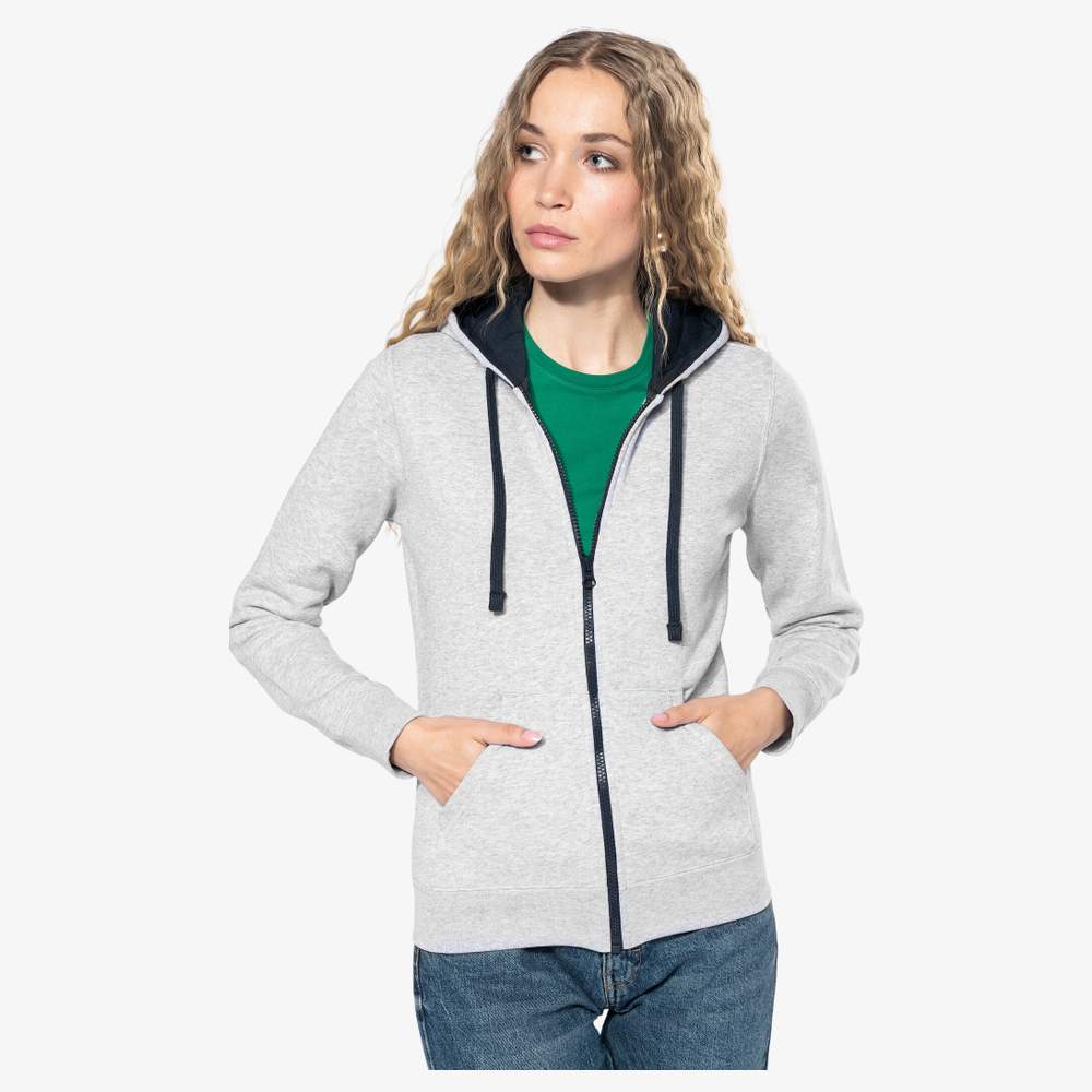 Zamknięty koszula z kapuściem w kontrastowym kolorze dla kobiet, wykonana z 80% bawełny pełniowej i 20% poliestru. Charakteryzuje się konstrukcją z grubego, miękkiego płótna dla zwiększonego komfortu. Model posiada kieszeń kangura oraz przejście dla słuchawek w obszarze karku. Obrzeża rękawów i dołu ubrania z elastycznym kołnierzem zapewniają optymalne dopasowanie. Kapuśnica jest podwójnie wyłożona i kontrastowa, z sznurówką do regulacji. Zamykany zamek YKK® w kontrastowym kolorze dodaje estetyki. Ta koszula zapewnia codzienny komfort i swobodę ruchu.