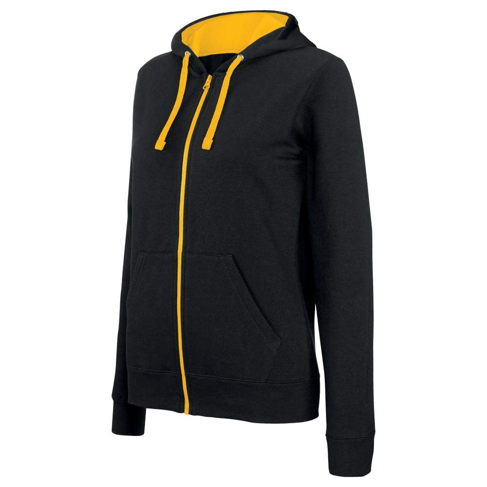 Zamknięty koszula z kapuściem w kontrastowym kolorze dla kobiet, wykonana z 80% bawełny pełniowej i 20% poliestru. Charakteryzuje się konstrukcją z grubego, miękkiego płótna dla zwiększonego komfortu. Model posiada kieszeń kangura oraz przejście dla słuchawek w obszarze karku. Obrzeża rękawów i dołu ubrania z elastycznym kołnierzem zapewniają optymalne dopasowanie. Kapuśnica jest podwójnie wyłożona i kontrastowa, z sznurówką do regulacji. Zamykany zamek YKK® w kontrastowym kolorze dodaje estetyki. Ta koszula zapewnia codzienny komfort i swobodę ruchu.