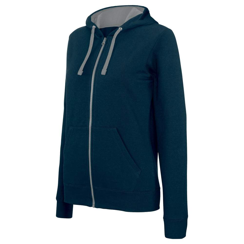Zamknięty koszula z kapuściem w kontrastowym kolorze dla kobiet, wykonana z 80% bawełny pełniowej i 20% poliestru. Charakteryzuje się konstrukcją z grubego, miękkiego płótna dla zwiększonego komfortu. Model posiada kieszeń kangura oraz przejście dla słuchawek w obszarze karku. Obrzeża rękawów i dołu ubrania z elastycznym kołnierzem zapewniają optymalne dopasowanie. Kapuśnica jest podwójnie wyłożona i kontrastowa, z sznurówką do regulacji. Zamykany zamek YKK® w kontrastowym kolorze dodaje estetyki. Ta koszula zapewnia codzienny komfort i swobodę ruchu.