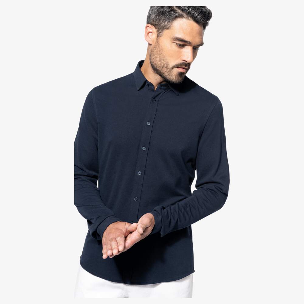 Koszula z długimi rękawami z bawełny z dzianiny w pasy, oferująca wygodę i elastyczność. Wykonana z 100% bawełny, posiada klasyczną zapięcia na guziki z guzikami w kolorze tła oraz regulowane mankiety. Jej zaokrąglony dołek zapewnia nowoczesny i wygodny kroj. Ta koszula jest idealna do personalizacji przez hakerkę, pozwalając dodać swój logo lub wizualizację dla unikalnego wizerunku marki.