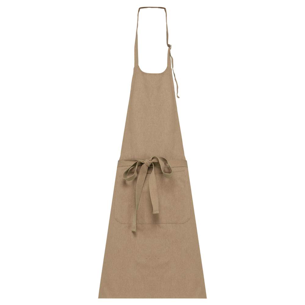 Ekologiczny fartuch unisexowy. Zaczepka regulacyjna w metalu do dostosowania długości fartucha. Duży przedni kieszeń podzielona na dwa przedziały. Pas na talii i kołnierz z recyklingowej bawełny, kolor Hemp dla wszystkich kolorów. Tkanina pochodząca z procesu recyklingowego, posiadająca lekkie wariacje barwne, dla unikalnego elementu.