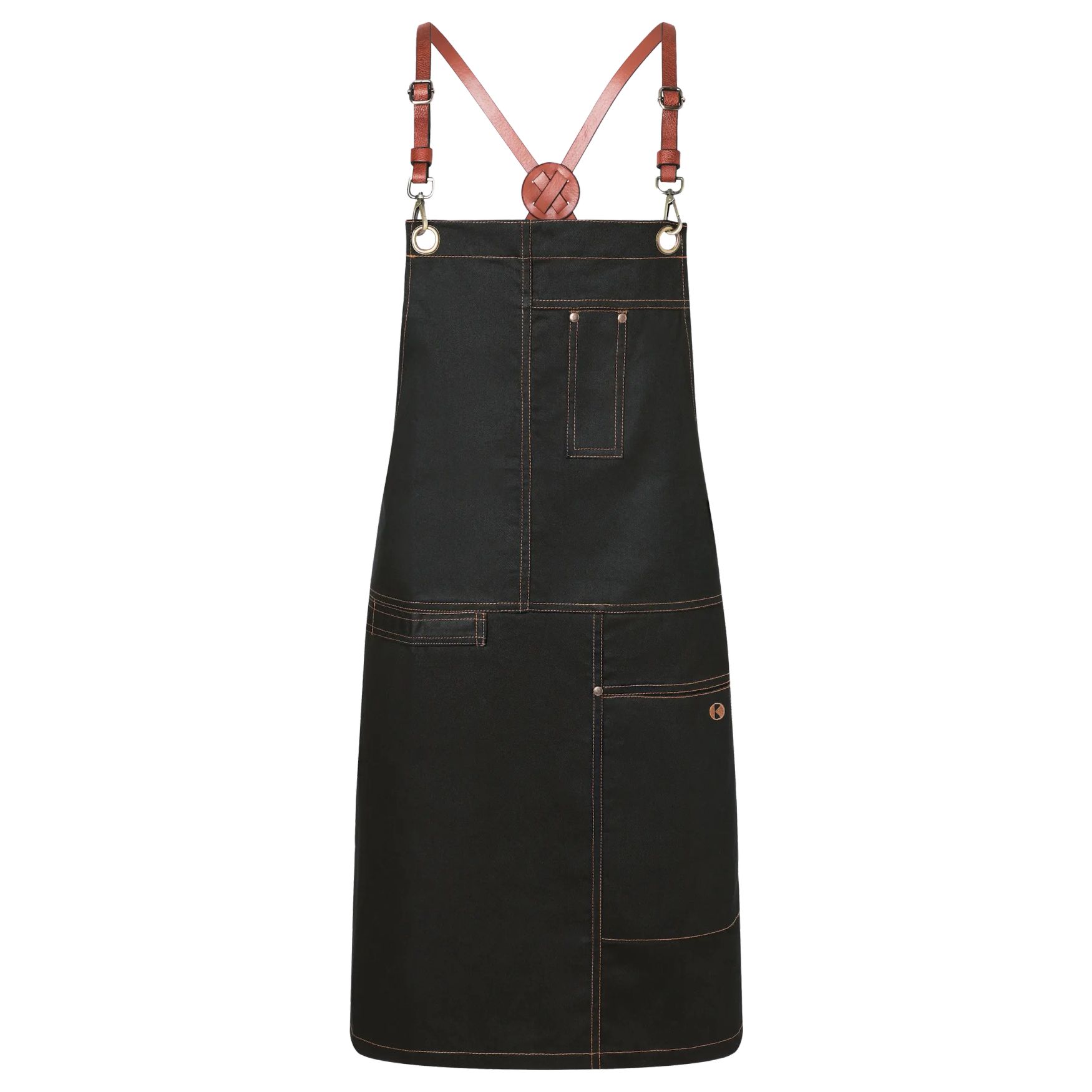 The bib apron urban x-style is a bib apron made of 100% cotton. It measures 68 x 80 cm and features crossed straps with carabiner clasps and buckles to adjust length. An additional strap at the waist adjusts width. The left side pocket of 16 x 24 cm includes a pen compartment. Rivets are bronze colored with contrasting topstitching. Straps are genuine leather and a fabric buckle is placed on the right side.