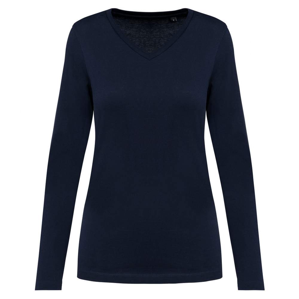 T-shirt z długimi rękawami, kolorem V dla kobiet. Tkanina z bawełny gładzonej Supima®. Miękki i jedwabisty materiał z długimi rękawami. Konstrukcja krojona i szyta. Kołnierz koloru V z taśmą czystości w tym samym kolorze. Wzmocnienie szwu ramiennego za pomocą taśmy silikonowej. Zakończenie rękawów i dołu ubrania z podwójną szwą. Bez etykiety marki na kołnierzu, tylko czip z rozmiarem.
