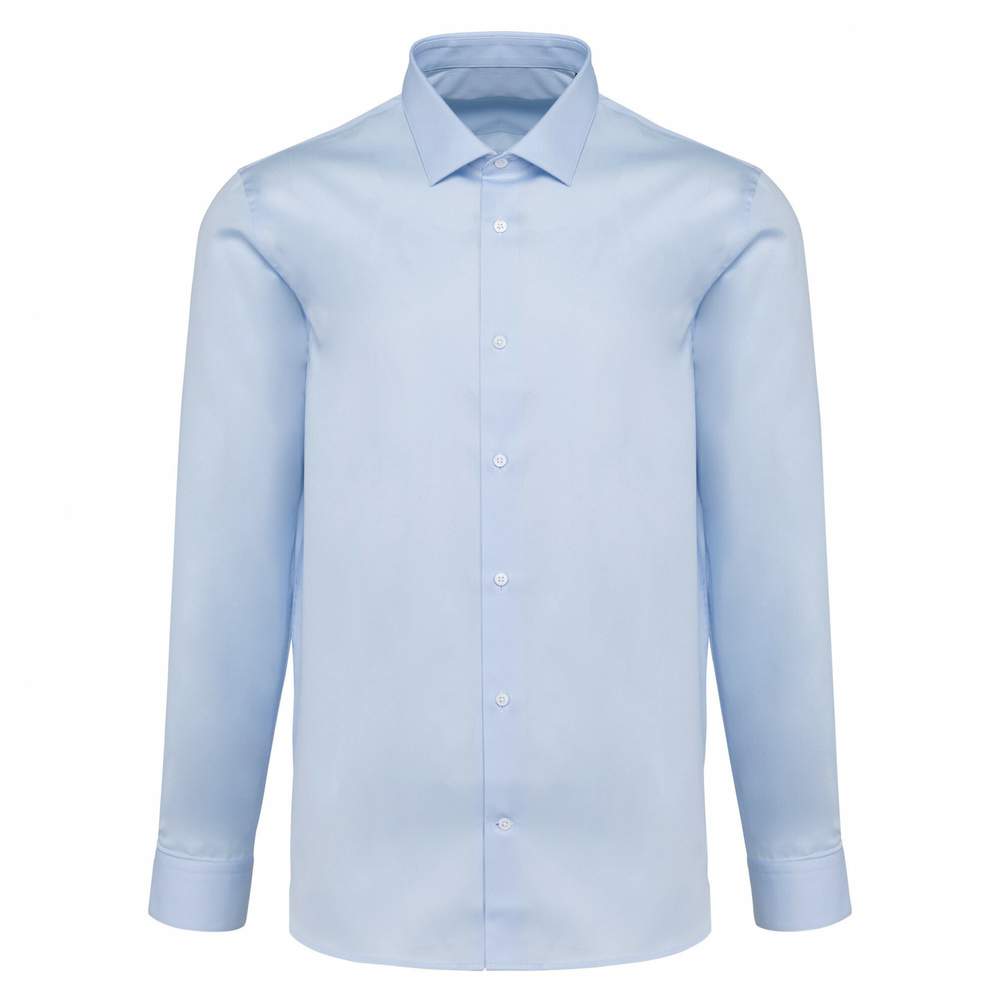 Męska koszula z długimi rękawami wykonana z materiału twill. Oferuje łatwe utrzymanie czystości dzięki swojemu specjalnemu przetworzeniu. Wykonanie wykorzystuje wysokiej jakości dwukierunkowe nici. Prezentuje włoski kołnierz z amowalnymi żebrami i guziki w perle. Wysokie podkładki pleców i dwie fałdy w plecach przyczyniają się do jej dopasowanego kroju. Rękawy są wyposażone w dwa guziki z zaokrąglonymi kątami i szpule na bokach. Brak etykiety marki jest kompensowany przez dyskretną etykietę rozmiaru. Skład: 100% bawełna.