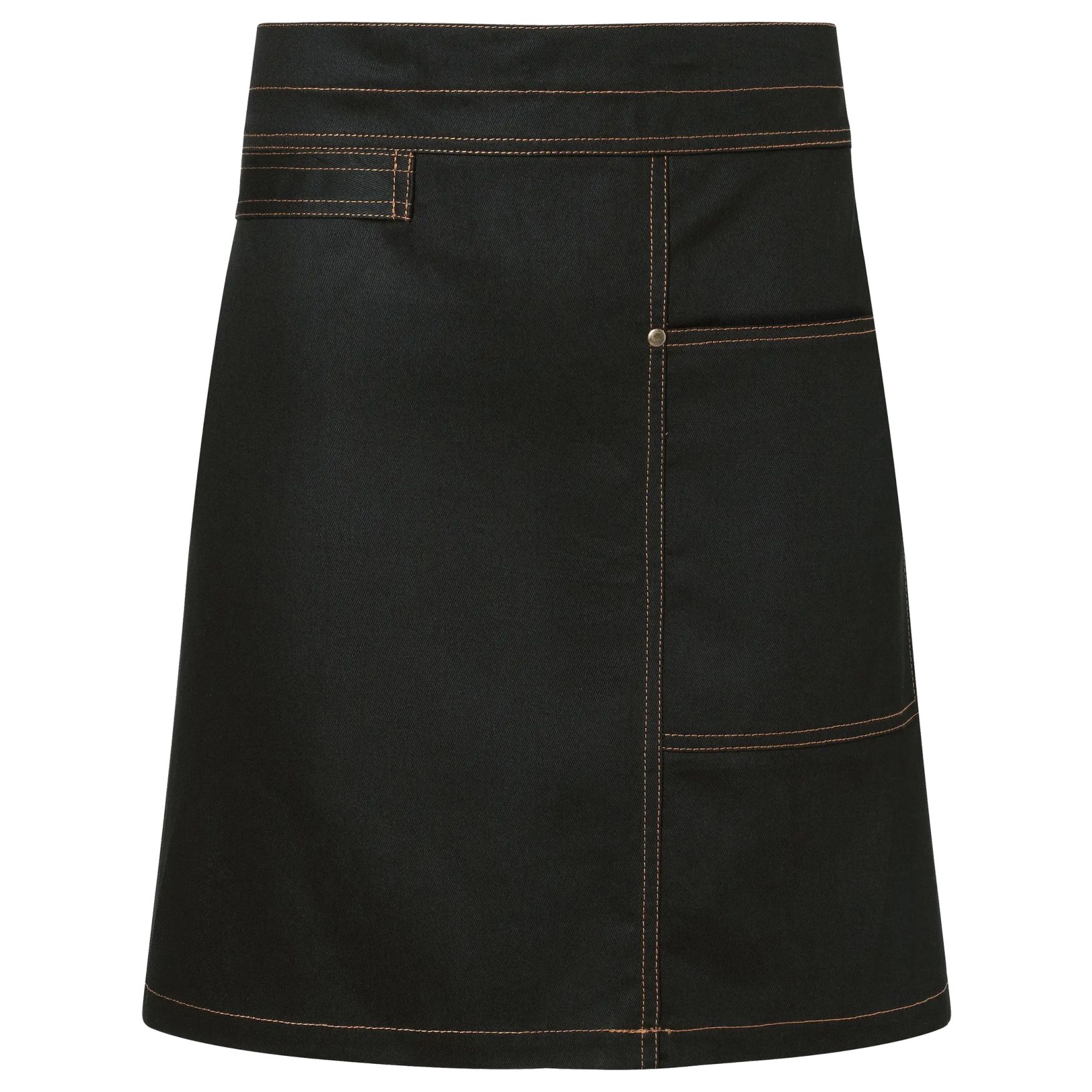The waist apron Urban Casual-Style is a 100% cotton apron with twill appearance, contrasting seams, and bronze-colored rivets. It includes a left side patch pocket and a fabric loop on the right side to attach accessories.