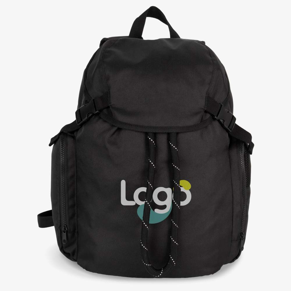 Plecak sportowy wykonany z 50% recyklingowanego poliestru. Plecak sportowy, silne inspiracje miejskie i casual. Górne zamknięcie przez klapę + dwie zapięcia z plastikowym klipsem. Zamknięcie głównego przedziału za pomocą dużej, przesuwnej sznurówki. Boczne kieszenie, w tym jedna z wewnętrznym przedziałem na buty lub przedmioty. Otwory wentylacyjne w kieszeniach. Wymiary: 30 cm x 17 cm x 49 cm. Pojemność: 25 litrów. Skład: 100% poliestru. Możliwość personalizacji przez haft lub dodanie logo.