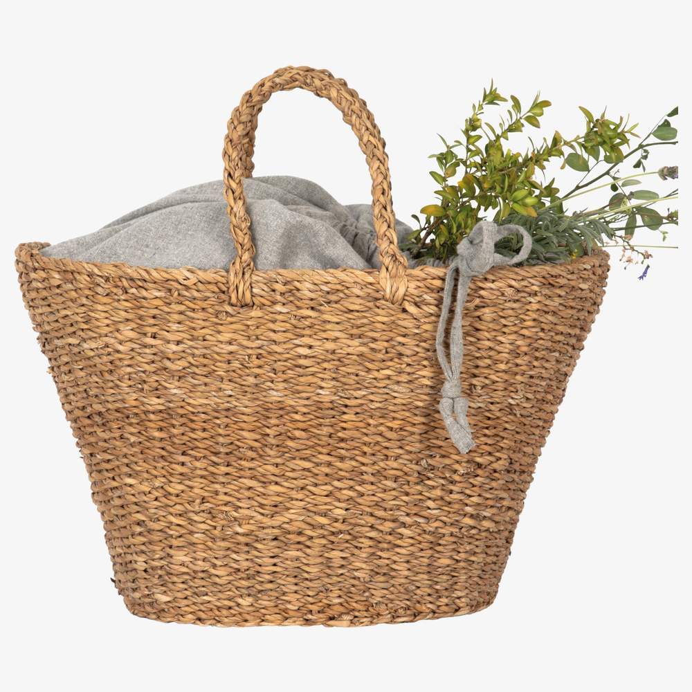 Ten ręcznie pleciony koszyk jest wykonany z włókna roślinnego z glonu morskiego. Jego wnętrzna podszewka jest ręcznie tkana z włókna z materiałów recyklingowych (80% bawełna, 20% poliestr) na tradycyjnych tkackich maszynach Bangladeszu, zwanych "Tant". Ten proces artystycznego wytwarzania nadaje artykułowi unikalny wygląd. Nabycie tego artykułu wspiera gospodarkę lokalną w wioskach Bangladeszu i promuje lokalną pracę kobiet. Ten koszyk oferuje pojemność 26 litrów, co czyni go praktycznym do różnych zastosowań.