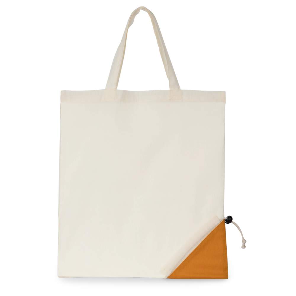 Zwirowana torba na zakupy z bawełny. Ta torba zwija się łatwo w swojej własnej torebce, zamykanej sznurkiem. Oferuje pojemność 1,5 litra i wymiary 38 cm x 42 cm, co czyni ją praktyczną do zakupów lub transportu lekkich przedmiotów. Jej zwijana konstrukcja umożliwia kompaktowe przechowywanie, gdy nie jest używana.