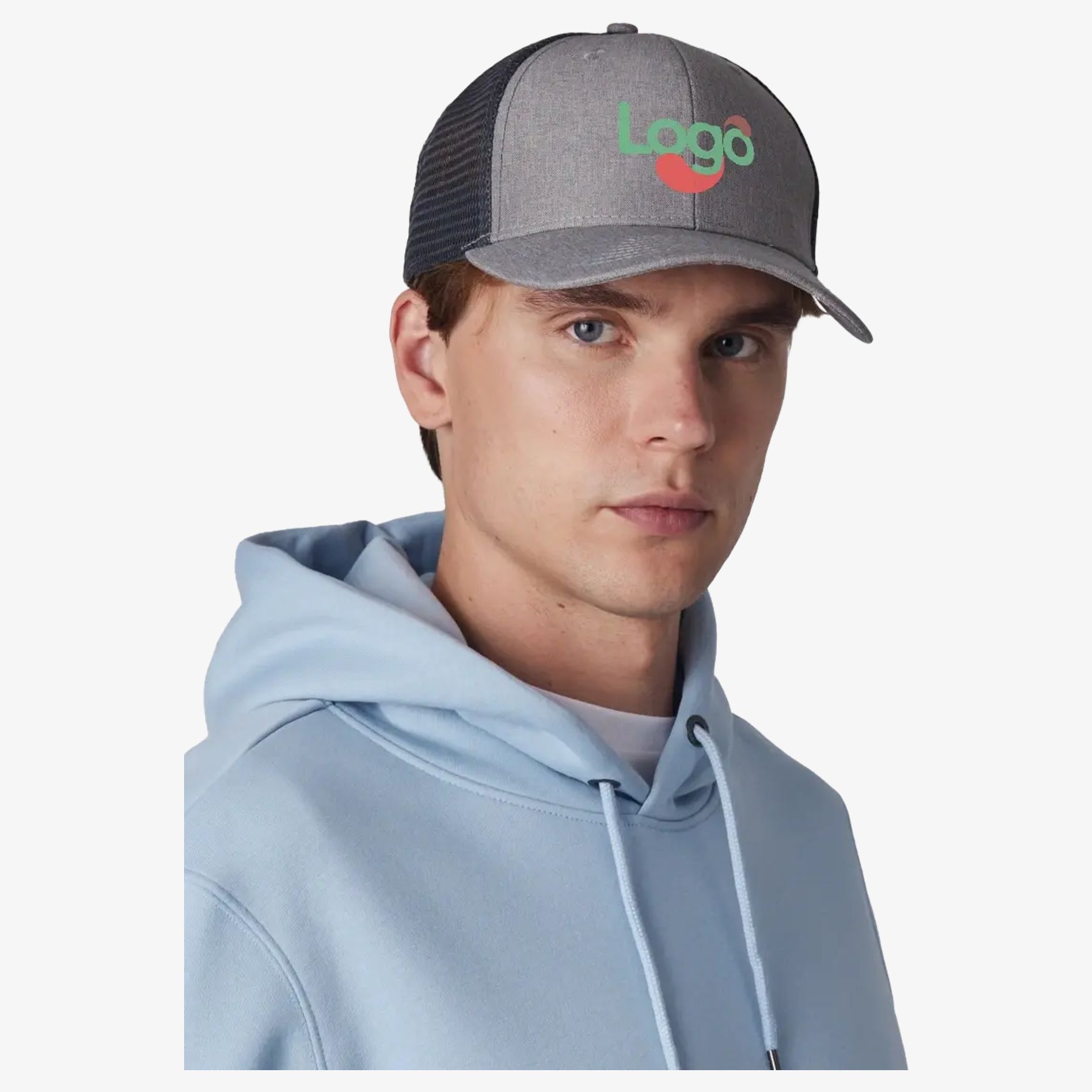 Czapka Trucker 6 paneli zawiera panele przednie z poliestru Oxford oraz siatkę z poliestru z recyklingu. Model posiada regulację Snapback dostosowaną do większości rozmiarów. Skład to 100% poliester.