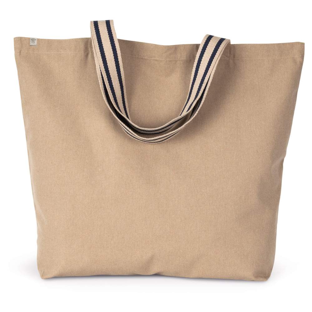 Duży torebka zakupowa z recyklingu, zaprojektowana do codziennego użytku lub podczas wydarzeń. Jej wymiary 60 x 16 x 50 cm oferują pojemność 48 litrów, idealną do przenoszenia rzeczy. Kontrastowe uchwyty o długości 60 cm i szerokości 4,25 cm zapewniają wygodne trzymanie. Torebka składa się z 80% bawełny i 20% poliestru, z opcją kompozycji 75% bawełny recyklingowej, 22% poliestru recyklingowego i 3% innych włókien w kolorze "Hemp & Horizon Blue". Możliwość personalizacji przez haftowanie lub druk logo pozwala dodać swoją tożsamość wizualną i stworzyć unikalny nośnik komunikacyjny.