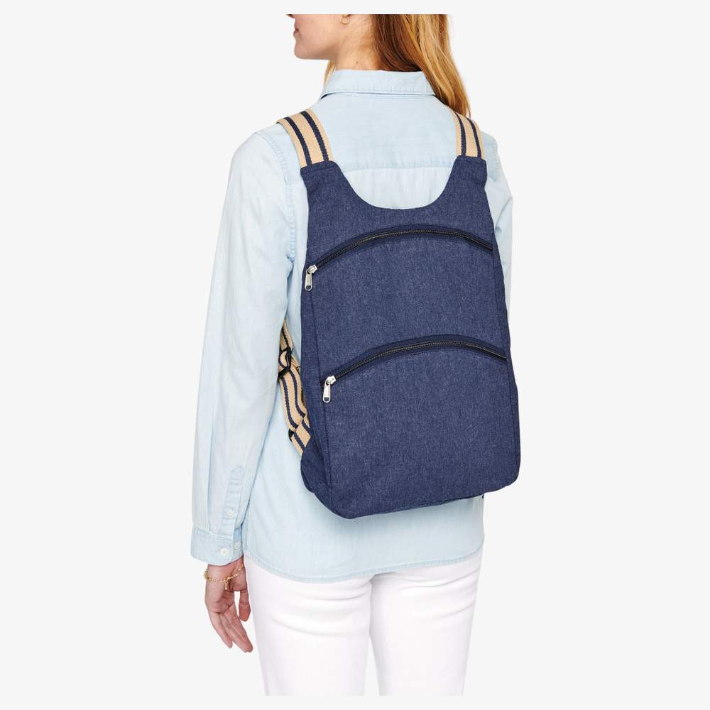 Torba plecaka z recyklingu z bawełny i poliestru. Wymiary: 28 x 10 x 47 cm. Pojemność: 11 litrów. Skład: 80% Bawełna, 20% Poliestr. Kontrastowe rączki o długości 69 cm i szerokości 4,25 cm. "Horizon Blue": 75% bawełna recyklingowa, 22% poliestr recyklingowy, 3% inne włókna. Ta torba plecaka oferuje praktyczne i ekologiczne rozwiązanie dla codziennego transportu. Jest zaprojektowana tak, aby zapewnić komfort i trwałość, jednocześnie minimalizując wpływ na środowisko dzięki użyciu materiałów recyklingowych. Możliwość personalizacji przez haft dla skutecznej komunikacji marki.