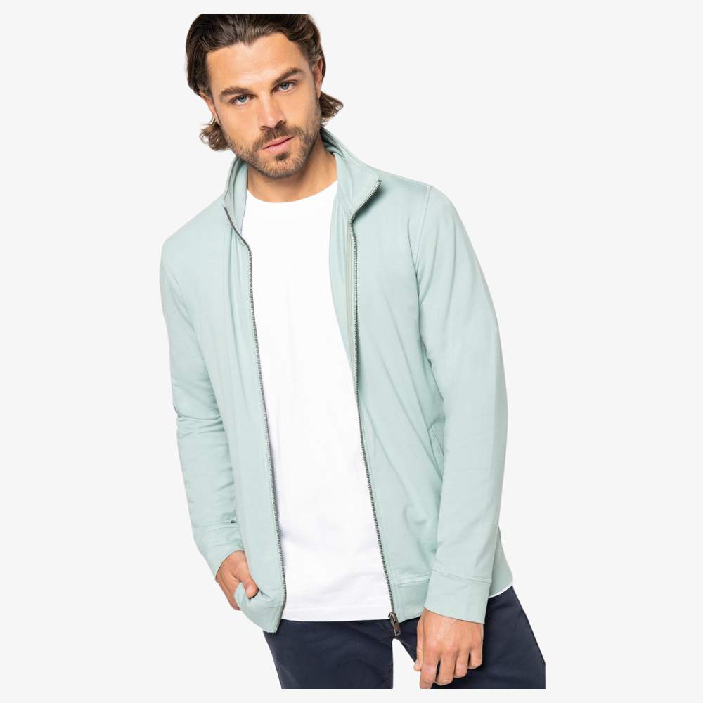 Męski sweter z kołnierzem stojącym, dopasowany kroju, stojący kołnierz. Bardzo miękki dotyk, półksiężyc na plecach. 2 przednie kieszenie, zamknięcie metalowe z recyklingu. Manaszka i dolna część ubrania oraz kieszenie z głównego materiału. Kołnierz z wnętrzną taśmą czystości z materiału głównego. Punkt nakładania na manaszce, rękawach, kapuści i dolnej części ubrania. Skład: 48% modalu TENCEL™, 47% organicznej bawełny, 5% elastanu. TENCEL™ jest znakiem towarowym Lenzing AG. Możliwość personalizacji haku dla unikalnego wyglądu.