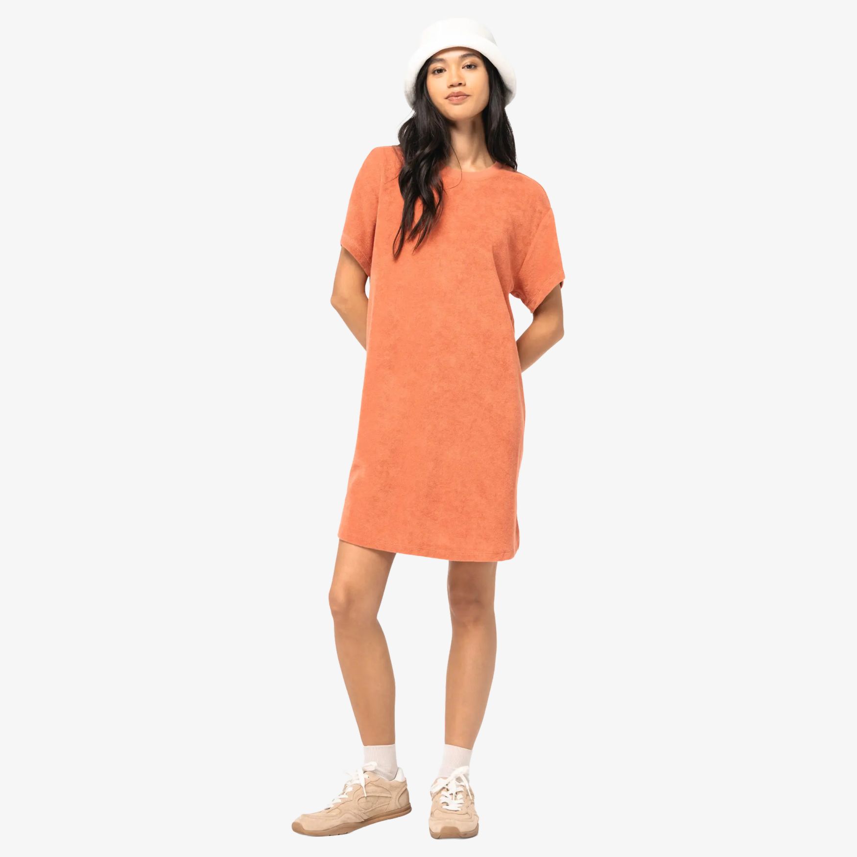 Damska sukienka tee-shirt z frotty z czesanej bawełny wyróżnia się prostym krojem i starannym wykończeniem, ze wzmocnieniem na ramionach, półksiężycem z tyłu oraz taśmą wzmacniającą w jodełkę ton w ton. Produkcja w Portugalii. Personalizacja możliwa.