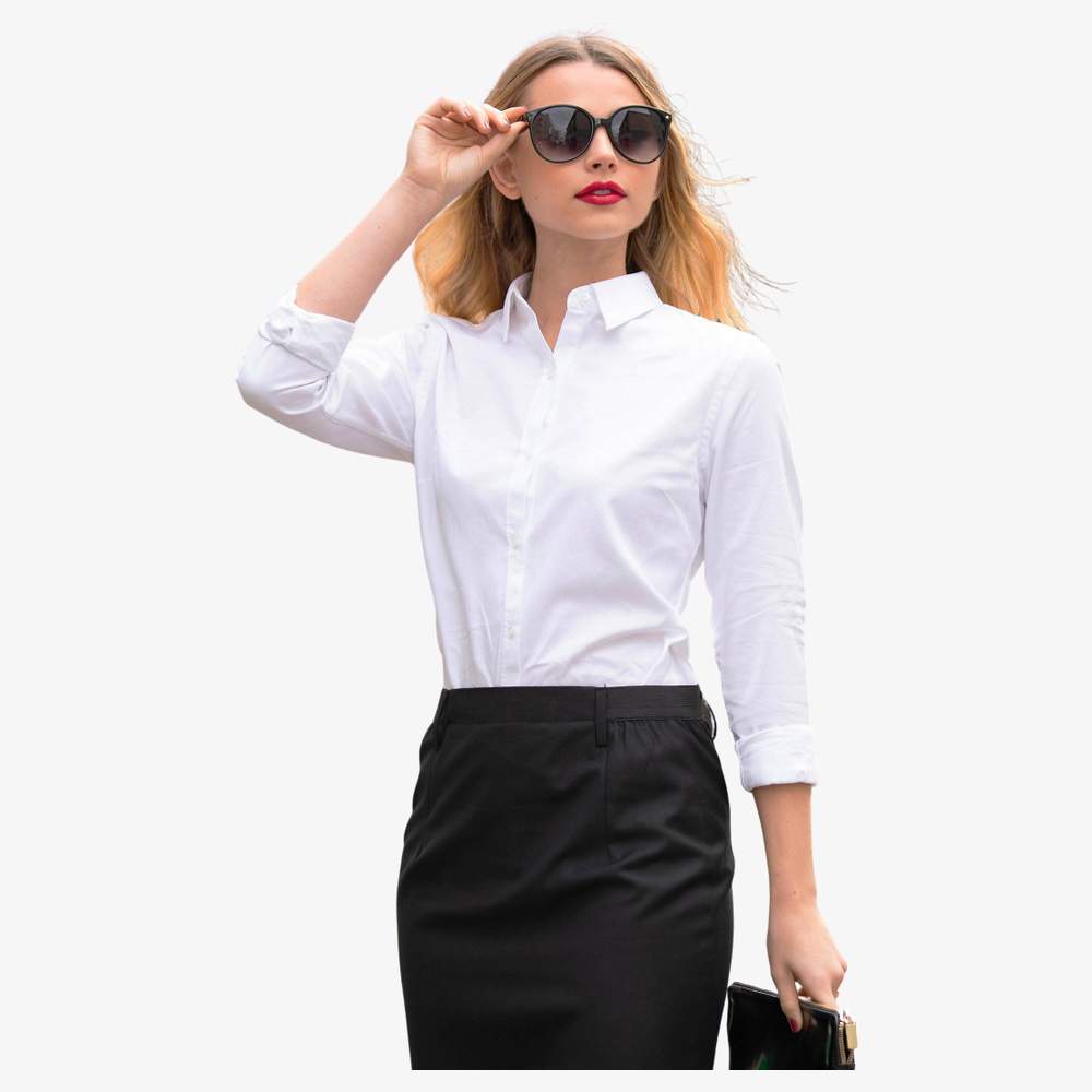 Koszula dla kobiet bez konieczności prasowania. Model z długimi rękawami i klasycznym kołnierzem. Zaokrąglone mankiety, 2 regulowane guziki i patka z 7 guzikami. Żebra na klatce piersiowej i plecach.