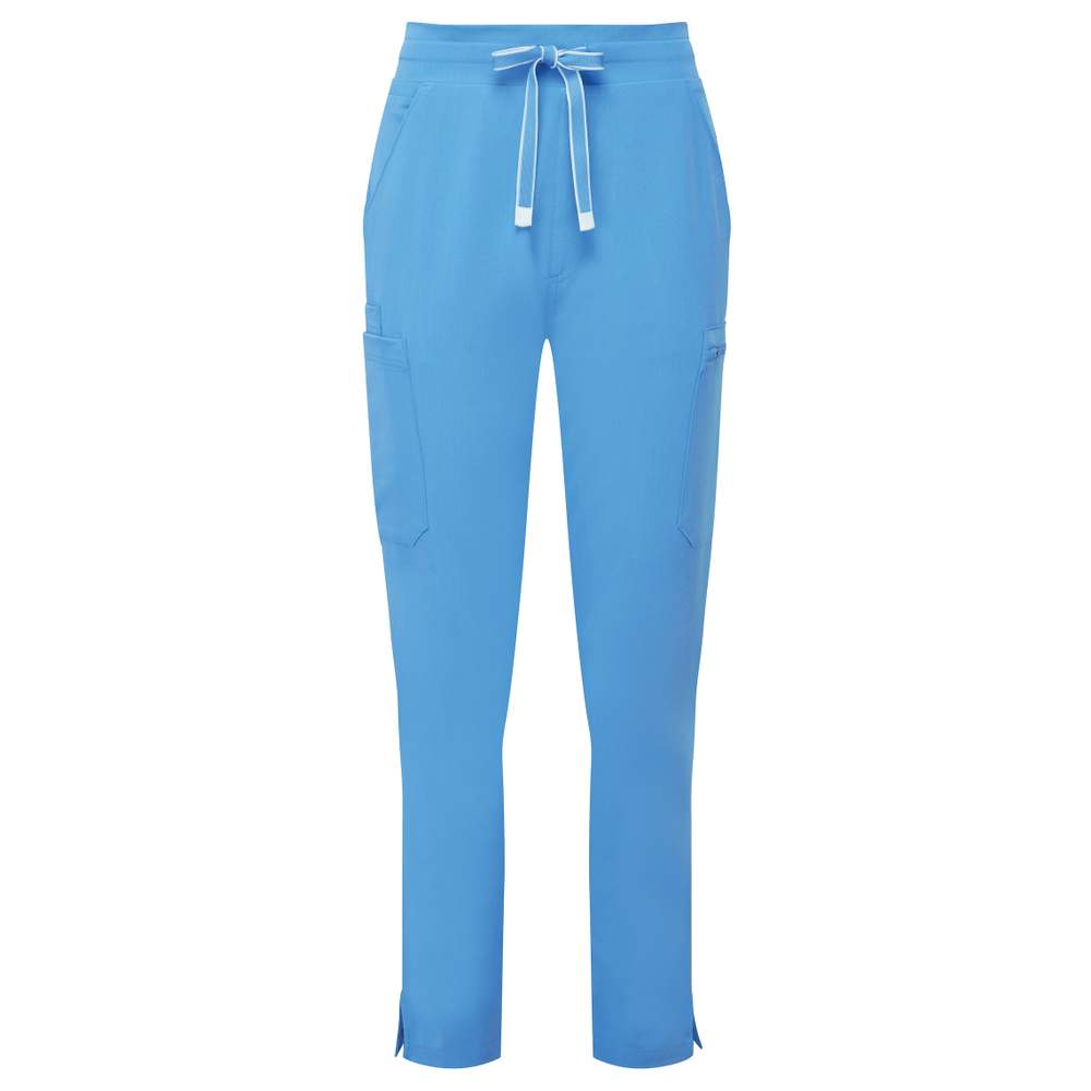 Spodnie cargo do stroju medycznego dla kobiet. Tkanina komfortowa, czteroelementowa, pozwalająca na duże swobodne ruchy. Przewiewna dla zwiększonego komfortu, łatwa w utrzymaniu i odporna na zmarszczenia. Pas z częściowo elastycznym i regulowanym sznurem do zapięcia oraz fałszywym guzikiem na zapięcie dla optymalnego dopasowania. Wiele kieszeni z zapięciem na zamek, w których można bezpiecznie przechowywać telefon komórkowy i małe monety. Boki z otworami na szwie dla większej mobilności. Zawiera recyklingowany poliestr.