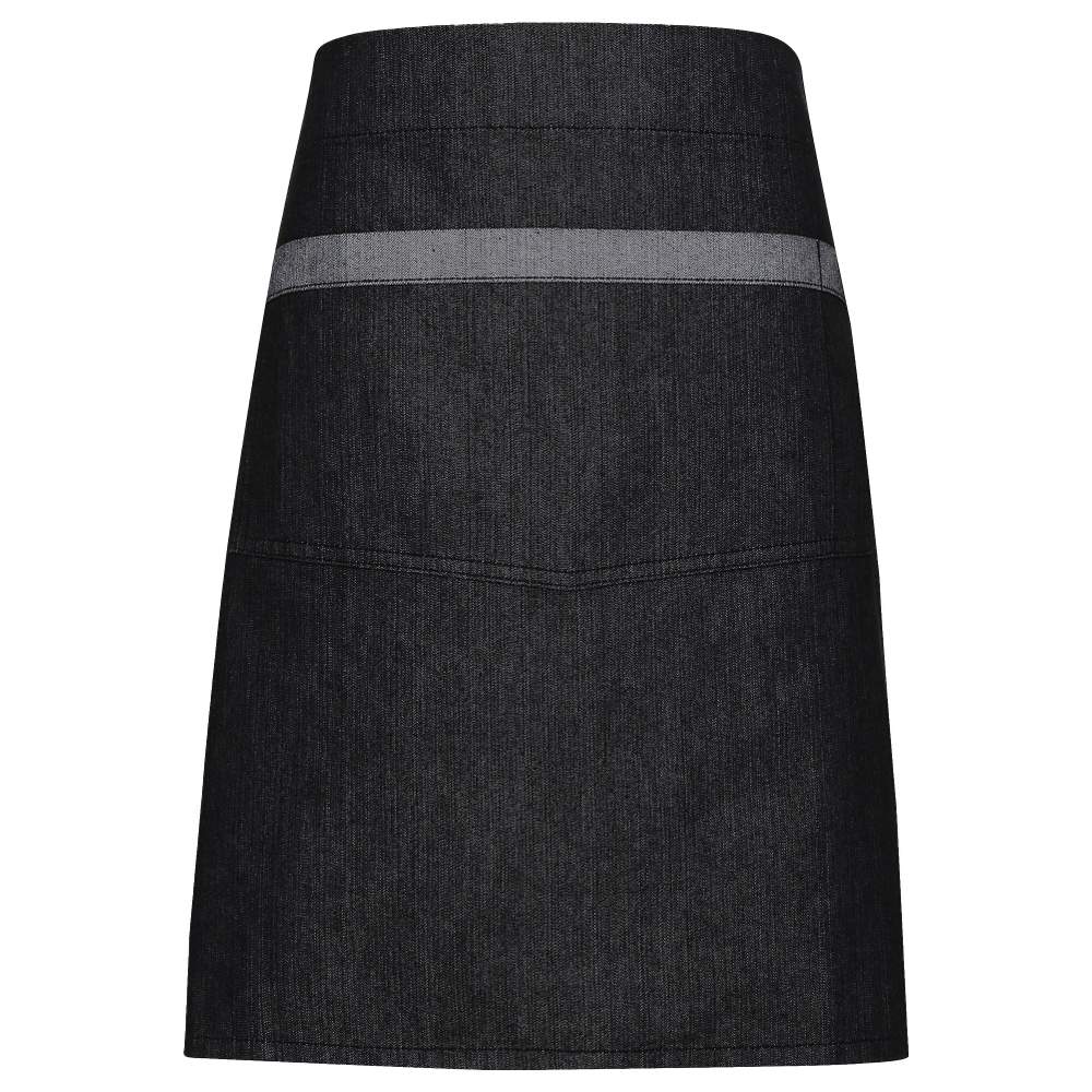 Fartuch średniej długości przeznaczony do użytku ogólnego. Charakteryzuje się kontrastowym wyglądem dzięki połączeniu różnych odcieni denimu. Centralny kieszeń o długości 36 cm oferuje praktyczne miejsce na przechowywanie, uzupełnione o osobny dzialeń na długopisy. Wiązania w talii, zamocowane za pomocą metalowych uszczelkowanych oczek, pozwalają na dostosowanie do indywidualnych potrzeb. Wymiary fartucha to 50 cm szerokości i 70 cm długości.