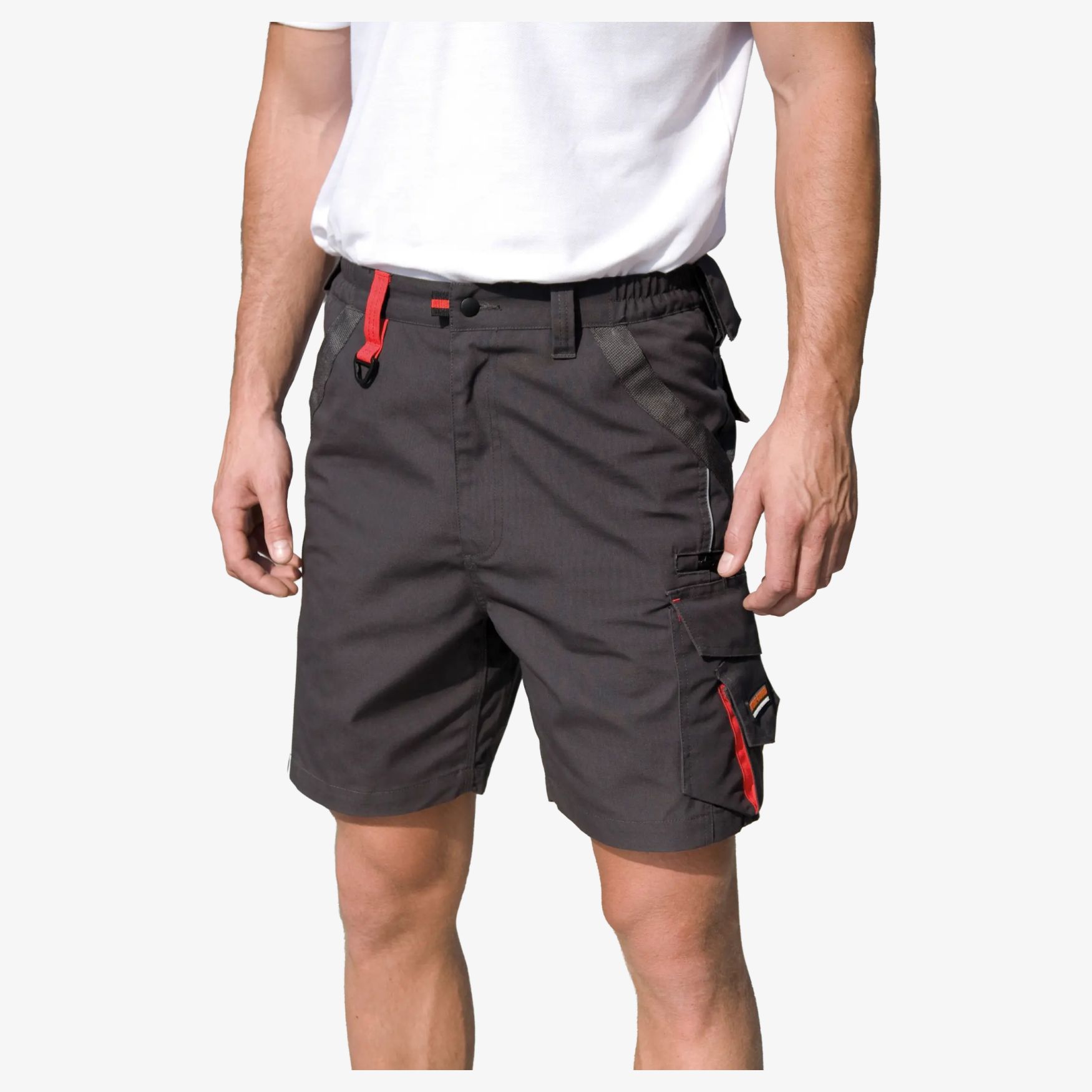 Te techniczne krótkie spodenki robocze zostały zaprojektowane w celu zapewnienia komfortu i funkcjonalności dla profesjonalistów. Wykonane są z mieszanki poliestru i bawełny, co zapewnia dobrą wytrzymałość i łatwe utrzymanie w czystości. Mają 2 boczne kieszenie, wielofunkcyjną kieszeń cargo i tylne kieszenie dla praktycznego przechowywania. Elastyczny pas i pasa skórne zapewniają wygodne i dostosowane dopasowanie. Kontrastowe czarne panele i czerwone szwy nadają stylowy wygląd. Tkanina kontrastowa jest z 100% poliestru.