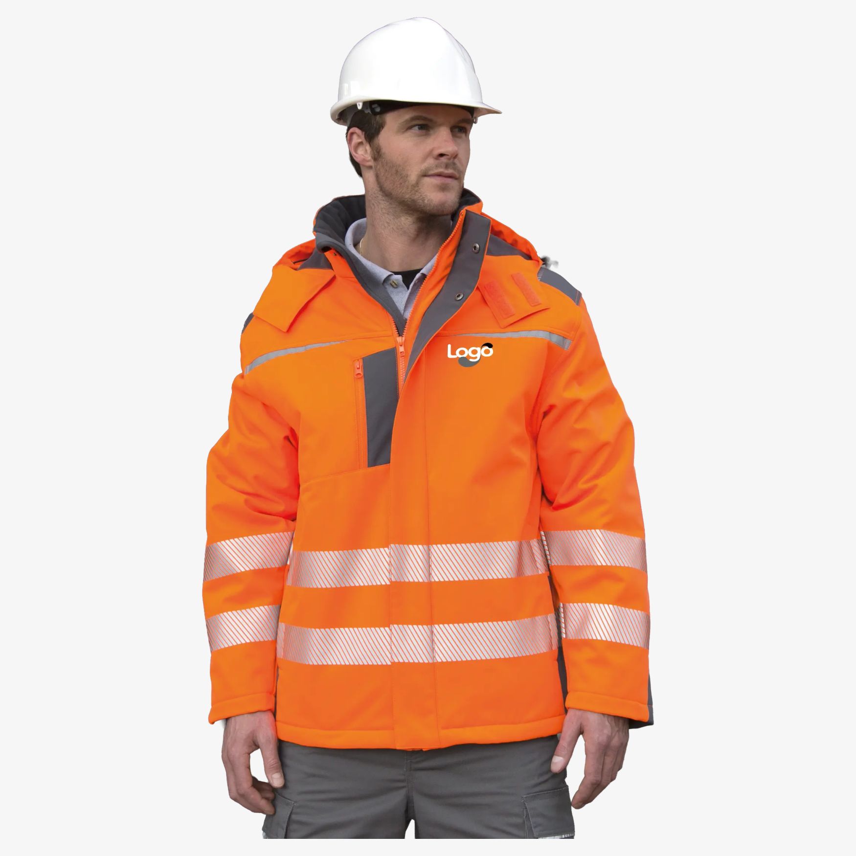 Dynamic Softshell coat to długa, 3-warstwowa kurtka softshell o charakterze odzieży bezpieczeństwa, z regulowanym, chowanym kapturem, nadrukowanymi taśmami bezpieczeństwa oraz kilkoma kieszeniami na zamek. Zapięcie na zamek z listwą ochronną, osłona podbródka, wewnętrzna ochrona przy mankietach oraz dół regulowany ściągaczem.