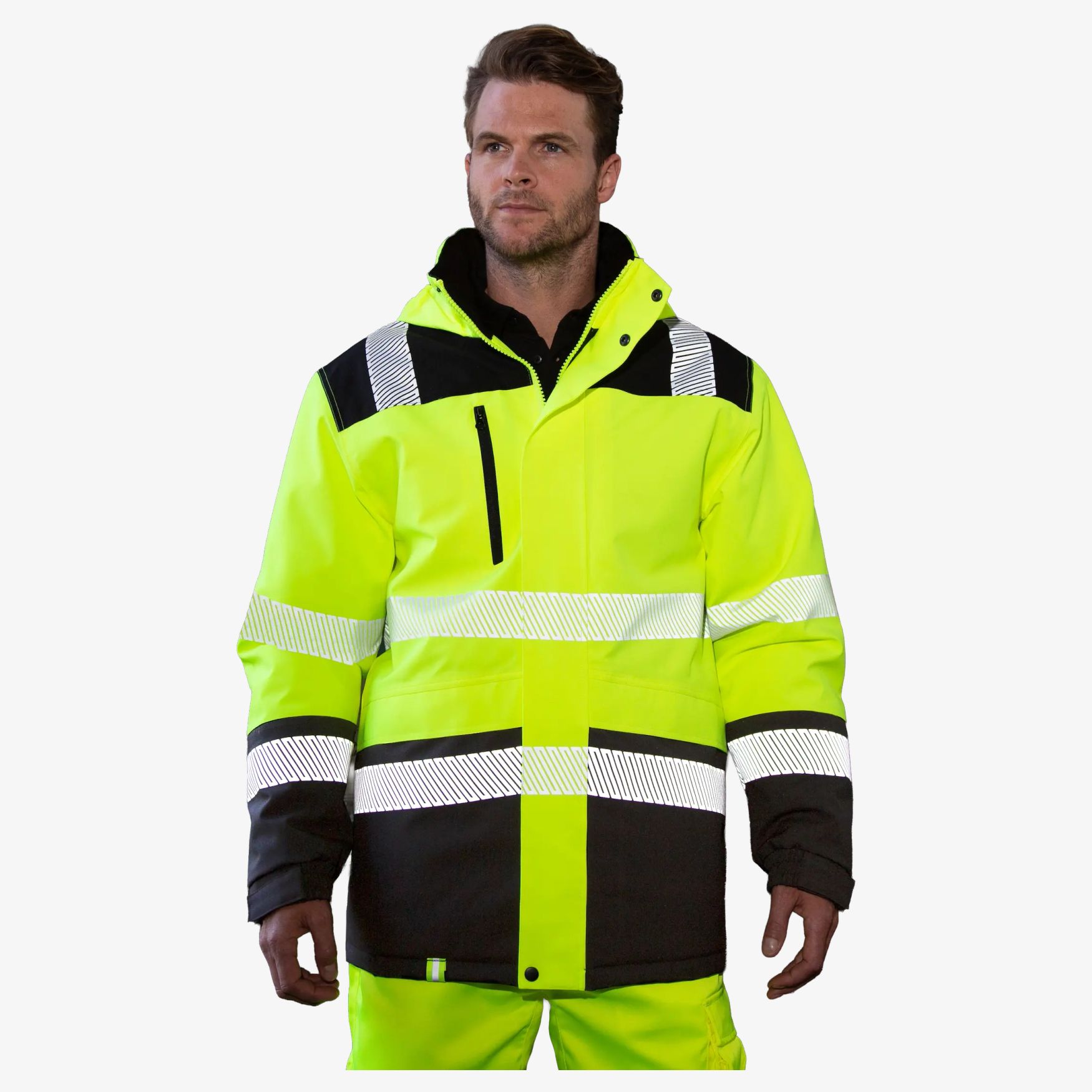 Recycled Softshell coat to wodoodporny płaszcz o wysokiej widoczności z chowanym kapturem, taśmami odblaskowymi i klejonymi szwami. Pikowana podszewka oraz kieszenie wewnętrzne i zewnętrzne nadają się do codziennego użytku.