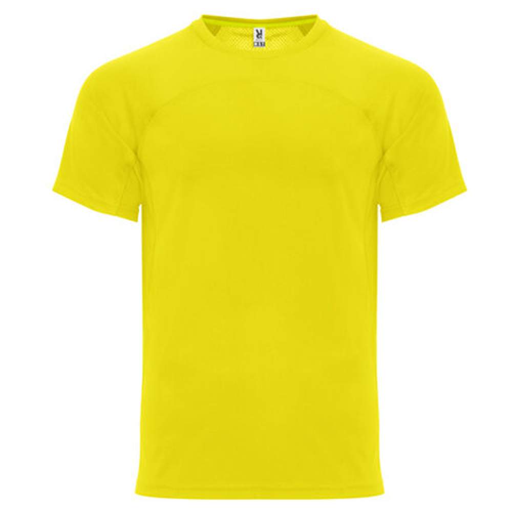 T-shirt techniczny z krótkimi rękawami uniseks. Okrągły kark z wzmocnionym i kontrastowym żółtym pasek. Połączenie z tyłu z dwoma tkaninami z poliestru. Model oddychający, łatwy do schniecia.