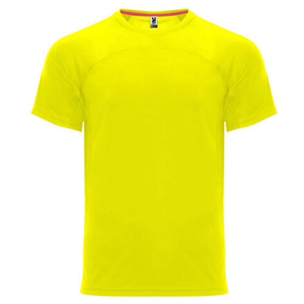 T-shirt techniczny z krótkimi rękawami uniseks. Okrągły kark z wzmocnionym i kontrastowym żółtym pasek. Połączenie z tyłu z dwoma tkaninami z poliestru. Model oddychający, łatwy do schniecia.