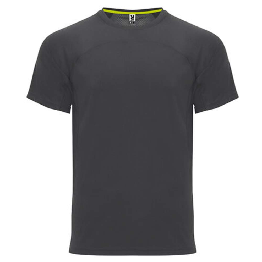 T-shirt techniczny z krótkimi rękawami uniseks. Okrągły kark z wzmocnionym i kontrastowym żółtym pasek. Połączenie z tyłu z dwoma tkaninami z poliestru. Model oddychający, łatwy do schniecia.
