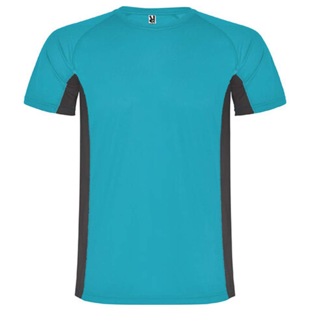 T-shirt techniczny kombinowany z dwoma tkankami z poliesteru, krótkimi rękawami raglanowymi. Główne materiały bird`s eye oraz boczne panela i wewnętrzna część rękawów w mikroporowanej tkaninie. Okrągły kołnierz z paskiem czystości wzmacniającym. Komfortowy i dopasowany T-shirt. Znacznik odłączalny. Materiał techniczny. Specjalnie do sublimacji. Oddychająca tkanka. Duo koncept.