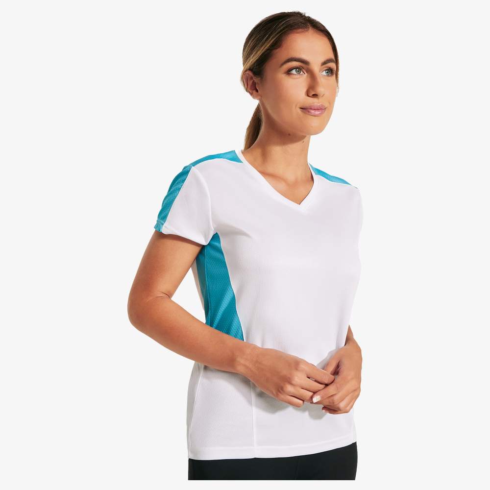 T-shirt techniczny o krótkich rękawach dla kobiet. Wycięcie V. Połączone panele boczne i ramiona z dwoma tkaninami poliestrowymi. Główna tkanina bird´s eye, a tkanina 3D przewiewna na ramionach i panelach bocznych. Absorbująca wilgoć. Model przewiewny z łatwym suszeniem. Odłączalna etykieta. Tkanina techniczna. Specjalnie do sublimacji.