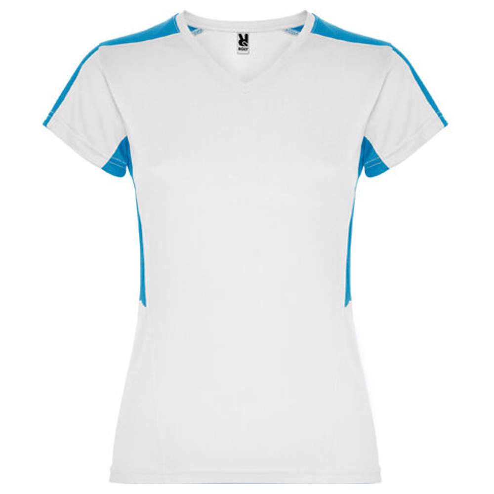 T-shirt techniczny o krótkich rękawach dla kobiet. Wycięcie V. Połączone panele boczne i ramiona z dwoma tkaninami poliestrowymi. Główna tkanina bird´s eye, a tkanina 3D przewiewna na ramionach i panelach bocznych. Absorbująca wilgoć. Model przewiewny z łatwym suszeniem. Odłączalna etykieta. Tkanina techniczna. Specjalnie do sublimacji.