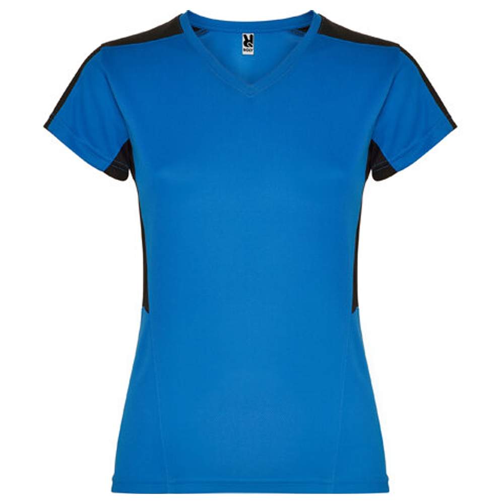T-shirt techniczny o krótkich rękawach dla kobiet. Wycięcie V. Połączone panele boczne i ramiona z dwoma tkaninami poliestrowymi. Główna tkanina bird´s eye, a tkanina 3D przewiewna na ramionach i panelach bocznych. Absorbująca wilgoć. Model przewiewny z łatwym suszeniem. Odłączalna etykieta. Tkanina techniczna. Specjalnie do sublimacji.