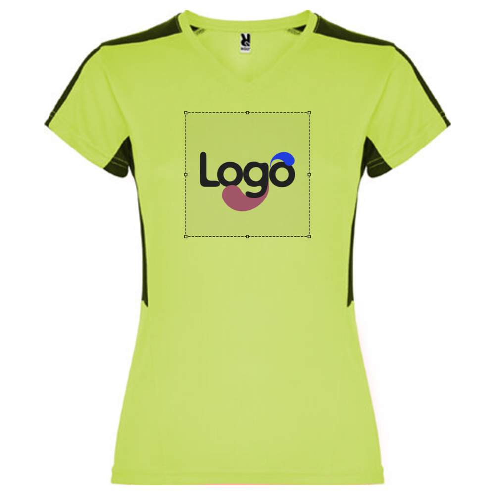 Koszulka techniczna z krótkimi rękawami dla kobiet. Krój V. Połączono płaty boczne i ramiona z dwoma tkaninami poliestrowymi. Główne tkaniny bird’s eye i tkanina 3D oddychająca na barkach i płatach bocznych. Tkanina absorbująca wilgoć. Model oddychający z łatwym suszeniem. Odłączalna etykieta. Tkanina techniczna. Specjalna sublimacja. Możliwość personalizacji za pomocą swojego loga lub wizualu.