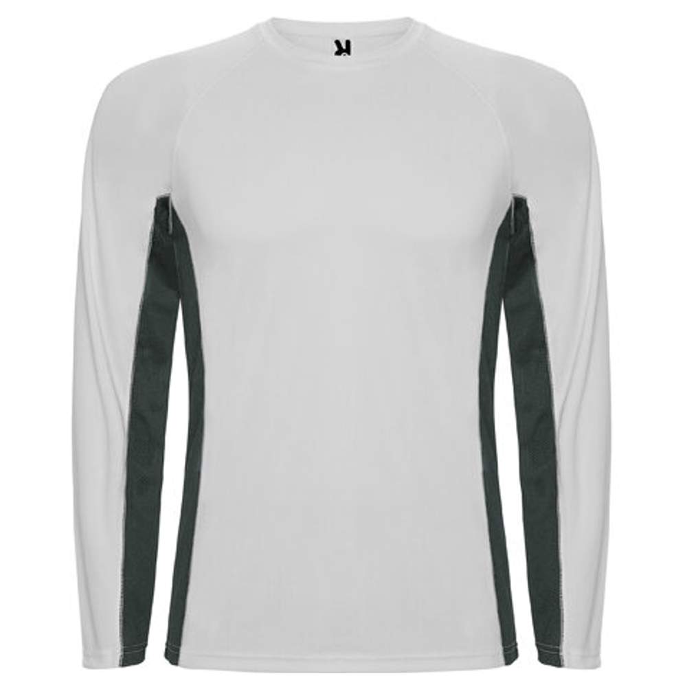 Koszula z połączeniem dwóch tkanin z poliestru. Długie rękawy w stylu raglan. Główny materiał bird’s eye, a panele boczne i wnętrze rękawów z mikroperforowaną tkaniną. Okrągły kark z wzmocnionym pasem czystości. Koszula wygodna i dopasowana do ciała. Odłączalna etykieta. Techniczna tkanina. Specjalna sublimacja. Wentylacyjny model.
