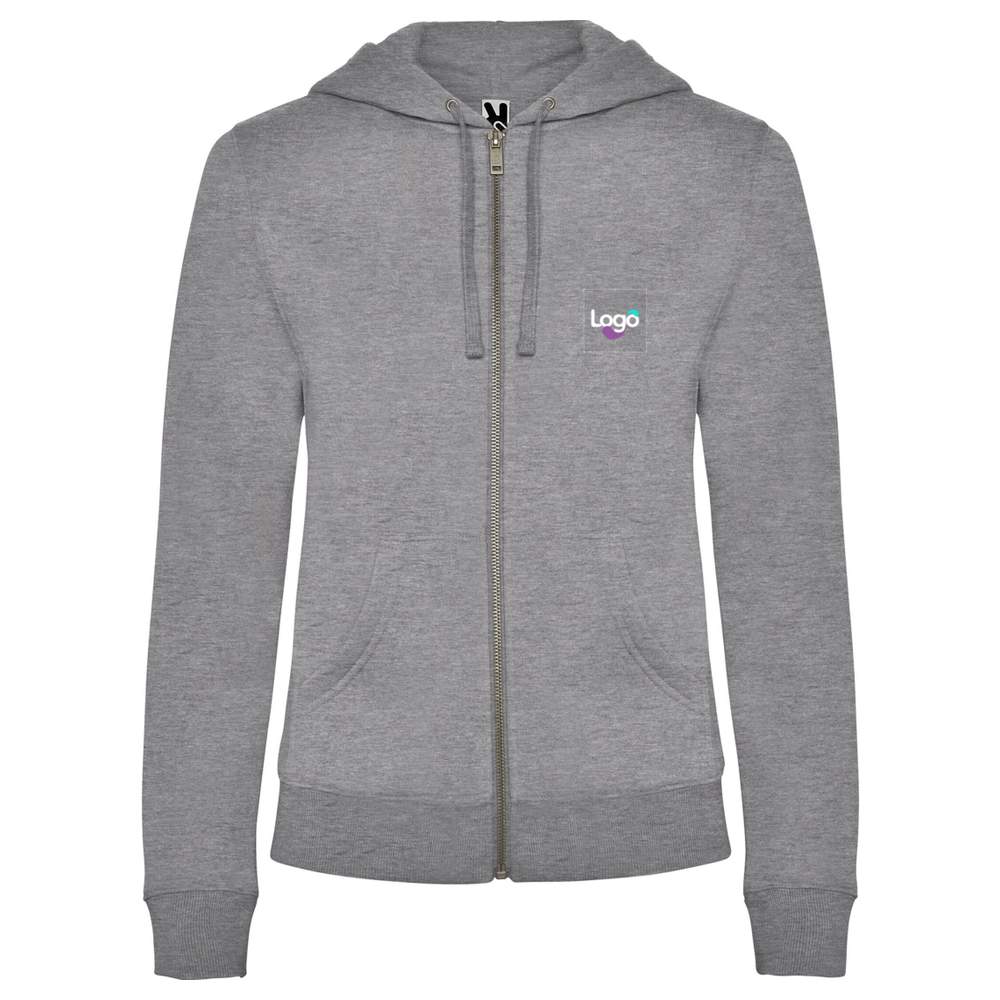 Koszula z kapturkiem dla kobiet z podszewką w kolorze ton na ton. Przedni blesk metalowy i kieszeń kangura. Wzmocniony pas czystości wewnątrz kołnierza. Rękawy i pasek w 2x2 kostce. Fason ciasny przy ciele. Kolor szary chiny 58: 50% bawełna / 50% poliestr. Blesk metalowy srebrny. Etykieta odłączalna. Siatka fleecowa. Oprócz antybłędników.