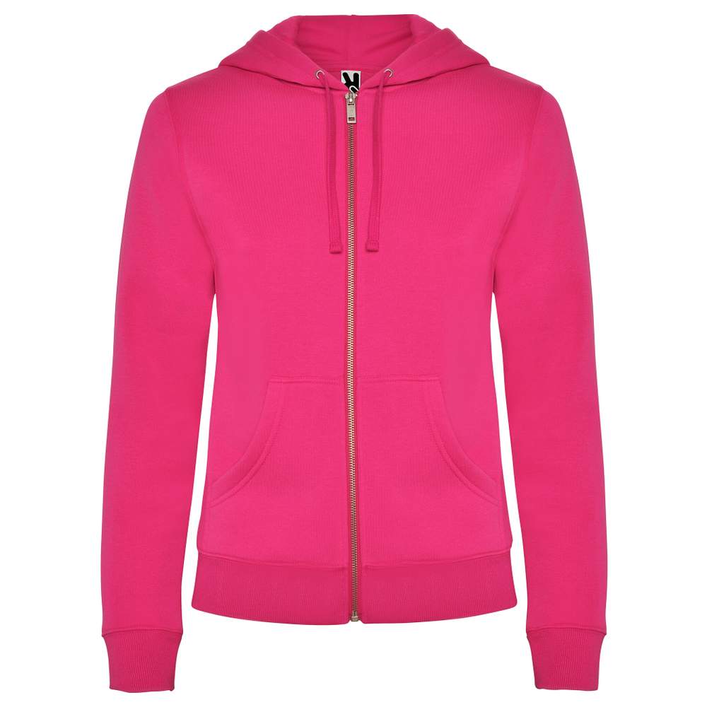 Koszula z kapuchem dla kobiet ton w ton. Zamek błyskowy metaliczny z przodu i kieszeń kangur. Wzmocniony pas na szyi od wewnątrz. Mankiety i talia 2x2. Krótkie ramiona.
