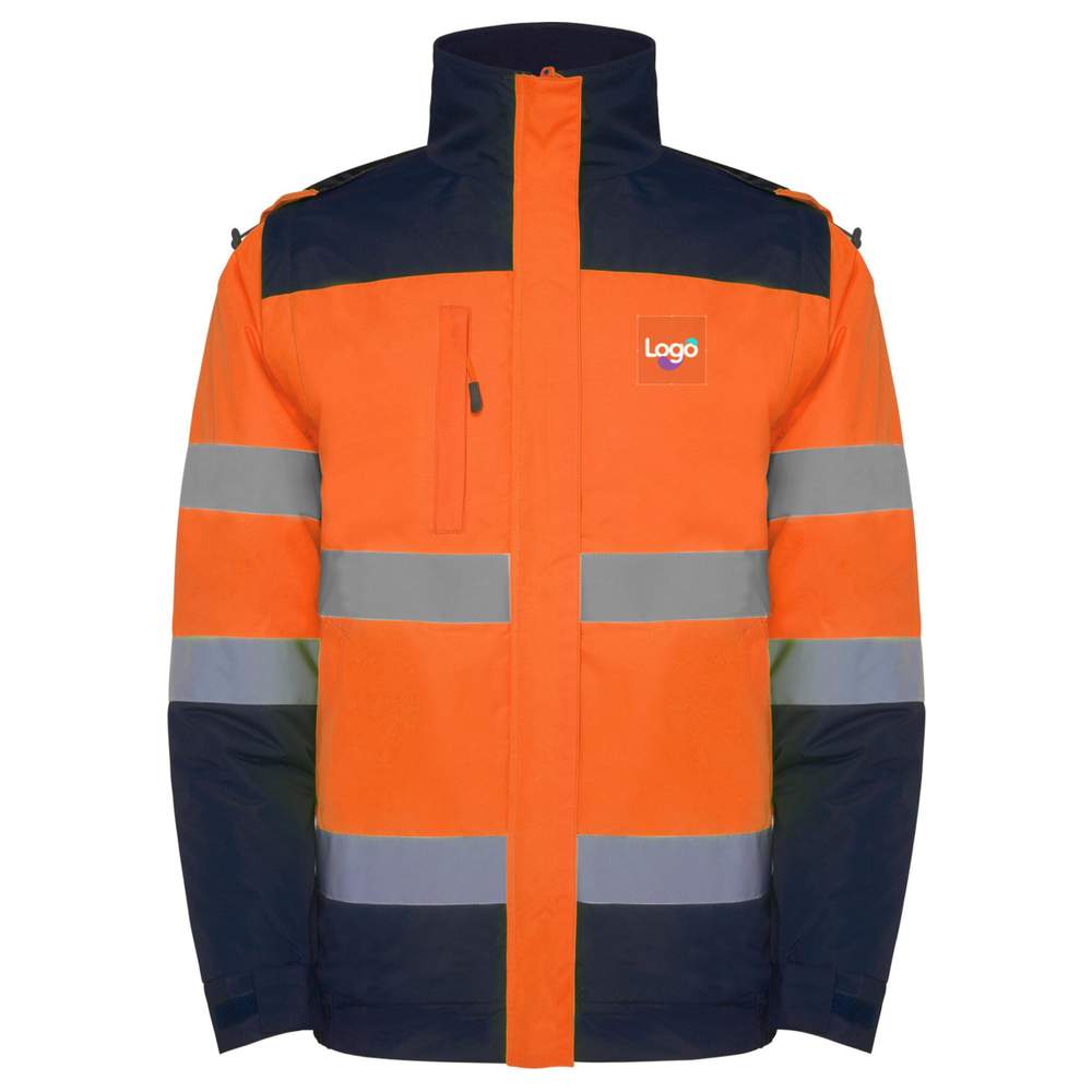 Parka wysokiej widzialności w dwóch kolorach. Odporna na wodę i wiatr. Dwie paski refleksyjne na tułowiu i rękawach. Kapelusz z fluo obwódką i regulowany za pomocą końcówek. Torba klatki piersiowej z zamkiem błyskawicowym. Dwie przednie kieszenie lekko nachylone do łatwego dostępu. Spodnica z gumką. Mankiety regulowane za pomocą gumki i taśmy samoczepnej. Dostęp wewnętrzny do znakowania. Wymienne rękawy. Certyfikacja CE zgodnie ze standardami: EN ISO 13688:2013/A1:2021, EN ISO 20471:2013/A1:2017. Klasa II. Wysoka widzialność. Model odporny na wodę. Model wiatroodporny. Skład: Zewnętrzna warstwa: 100% poliestru odpornego na wodę. Wyściółka: 100% poliestru. Wata: 100% poliestru. Możliwość dostosowania do haftu lub Twojego loga