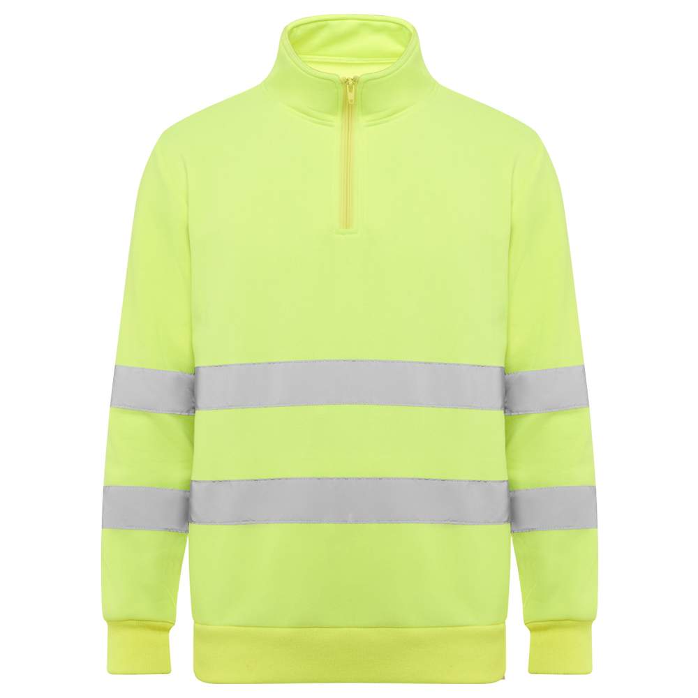 Sweat wysokiej widoczności z zipem, zaprojektowany w celu zwiększenia widoczności w warunkach słabego oświetlenia. Jest wyposażony w wysoki kołnierz z ochroną podbródka i ciągłą linką dla optymalnego komfortu. Dwa poziome odblaskowe paski są obecne na klatce piersiowej i rękawach, poprawiając widoczność. Wzmocniony pas czystości wewnątrz szyi przyczynia się do trwałości ubrania. Etykieta jest odłączalna dla zwiększonego komfortu. Ten sweat jest certyfikowany CE według norm EN ISO 13688:2013/A1:2021 i EN ISO 20471:2013/A1:2017, klasa II.