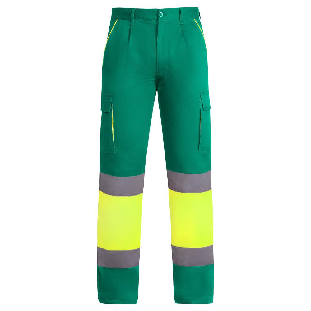 Pantalony o wysokiej widoczności podwójne z wieloma kieszeniami. Model dwukolorowy ze pasami o wysokiej widoczności. Kontrastowe detale na kieszeniach. Podszewka polarowa. Elastyczne pasy na plecach. Dwie kieszenie na przodzie. Dwie kieszenie z klapką i zamknięciem na rzepkę za pomocą paska samoprzylepnego na tylnej stronie. Dwie boczne kieszenie ze zbiorczym klapką i zamknięciem za pomocą paska samoprzylepnego. Spełnia normy CE: EN ISO 13688:2013/A1:2021 i EN ISO 20471:2013/A1:2017. Klasa I.