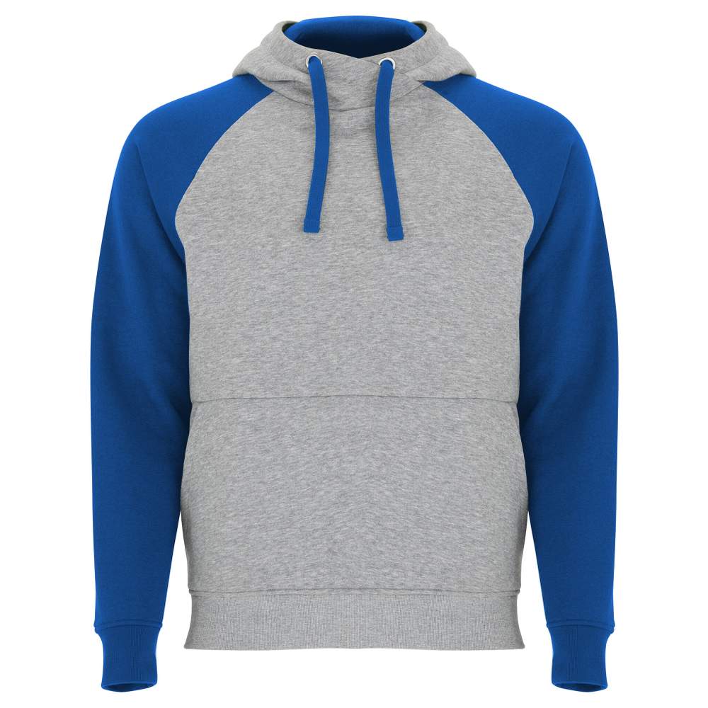 Dwukolorowy sweter uniseksowy. Kaptur z krzyżowym kołnierzem i metalowymi oczkami, wnętrze i sznurki kontrastujące. Rękawy raglan kontrastowe. Kieszonka kanguro. Mankiety i dół na kołku z elastanem 1x1. Etykietka odłączalna. Skład: 50% bawełna, 50% poliestr, siatka puchowa (z wyjątkiem koloru szaro-grubego: 55% bawełna, 40% poliestr, 5% wiskozę).