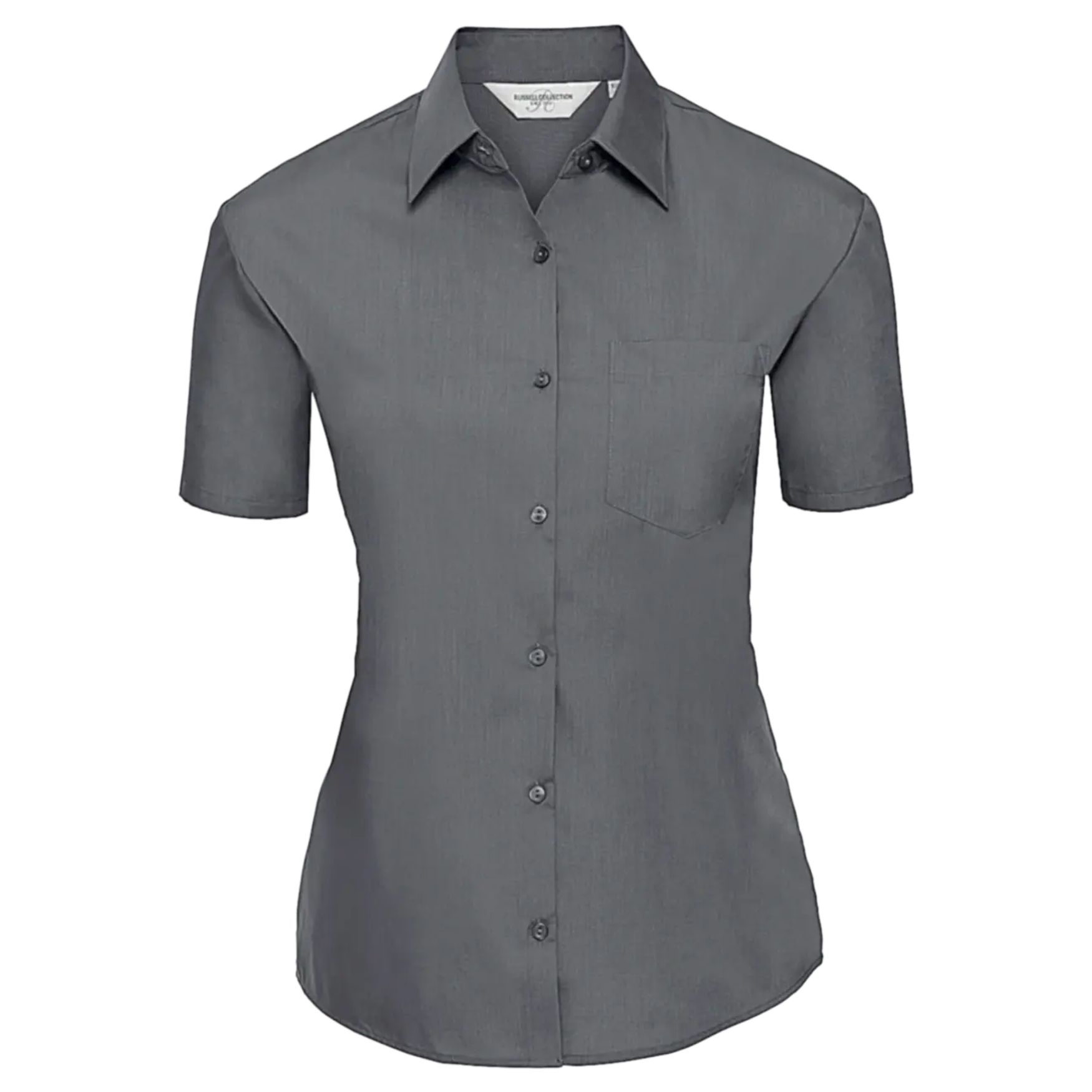 Koszula z krótkim rękawem damska uszyta z popeliny zawierającej 65% poliester i 35% bawełny. Posiada klasyczny krój z lekko zaokrąglonym dołem, klasyczny kołnierzyk z pojedynczym guzikiem i kieszeń na piersi. Guziki w tonacji.