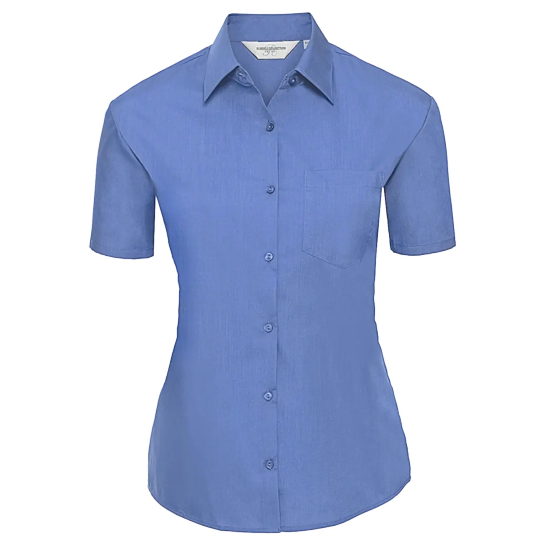Koszula z krótkim rękawem damska uszyta z popeliny zawierającej 65% poliester i 35% bawełny. Posiada klasyczny krój z lekko zaokrąglonym dołem, klasyczny kołnierzyk z pojedynczym guzikiem i kieszeń na piersi. Guziki w tonacji.