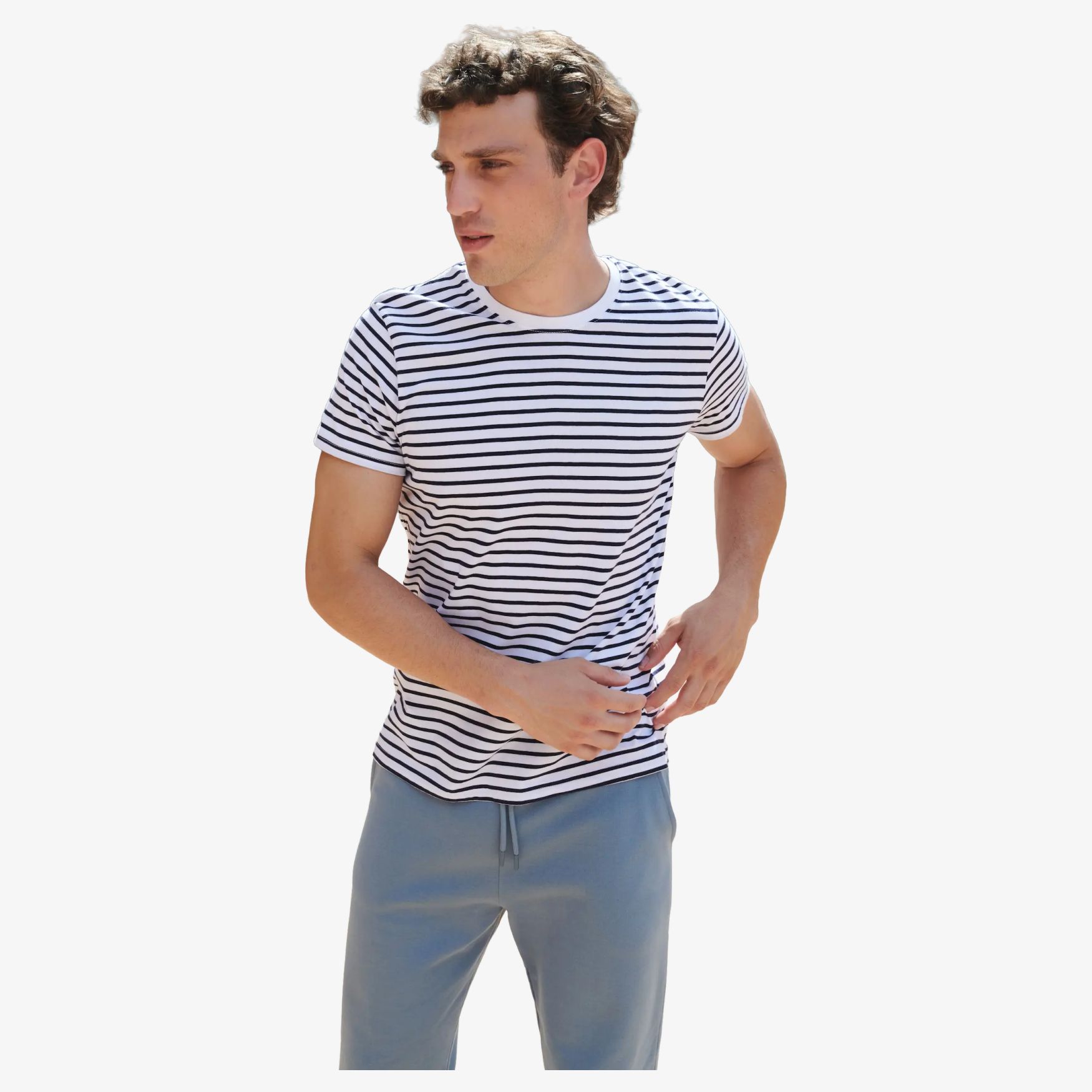 Unisexowy tee-shirt w paski z kołnierzem Stretch® i odpinaną metką. Skład to 100% bawełna, z wyjątkiem koloru heather grey/white zawierającego 85% bawełny i 15% wiskozy.