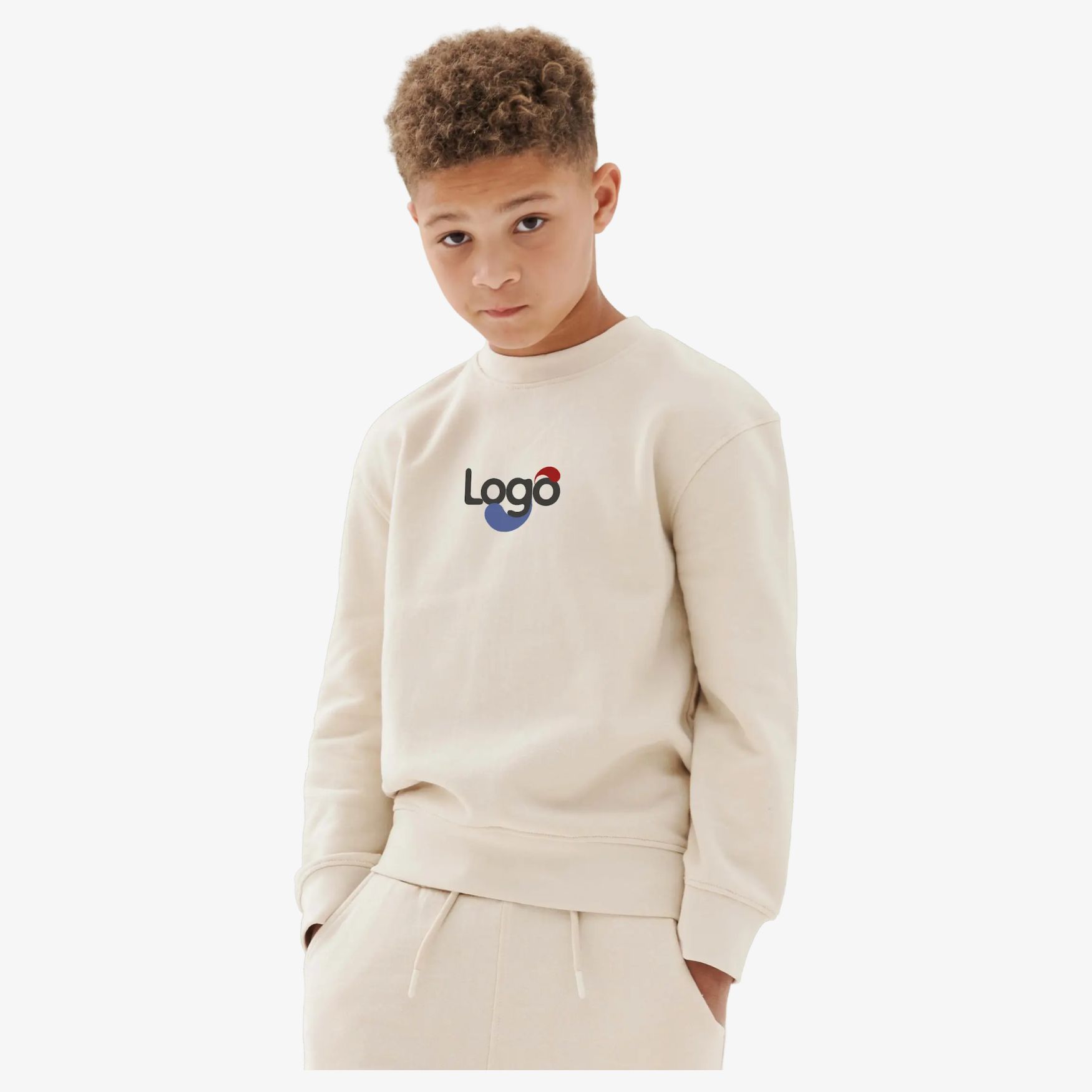 Bluza dziecięca o luźnym kroju z naszytymi rękawami i opadającymi ramionami. Tylne wykończenie jest dłuższe niż zaokrąglony przód, z niższym tyłem. Z okrągłym dekoltem, ściągaczami na mankietach i wstawką wzmacniającą z dżerseju na karku. Szwy w kolorze materiału, metka bez logo.