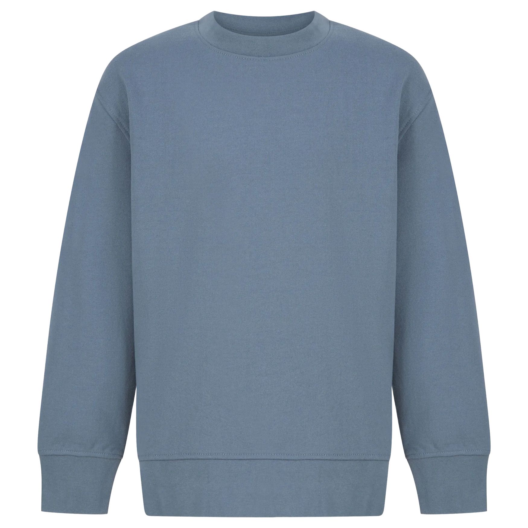 Bluza dziecięca o luźnym kroju z naszytymi rękawami i opadającymi ramionami. Tylne wykończenie jest dłuższe niż zaokrąglony przód, z niższym tyłem. Z okrągłym dekoltem, ściągaczami na mankietach i wstawką wzmacniającą z dżerseju na karku. Szwy w kolorze materiału, metka bez logo.